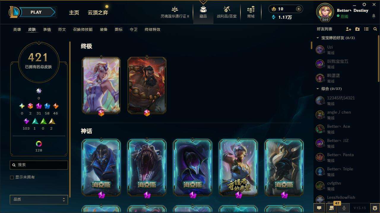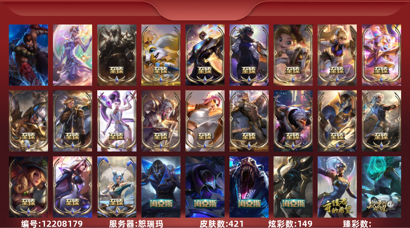 【10852692】[12208179]【gpz_961135】 t24743【恕瑞玛】421皮肤 149炫彩 5臻彩 31神话/58限定/46传说/165英雄 账号等级:269 【重要头像】至爱的鹿 我麦是开的么 小斗 灵魂莲华莉莉娅炫彩 至臻魅惑女巫莫甘娜 至臻太空律动璐璐 至臻战斗学院蕾欧娜 至臻福牛守护者菲奥娜 至臻女帝黛安娜 至臻奥术师佐伊 水晶圣骑蕾欧娜头 【重要皮肤】玉剑传说琴仙