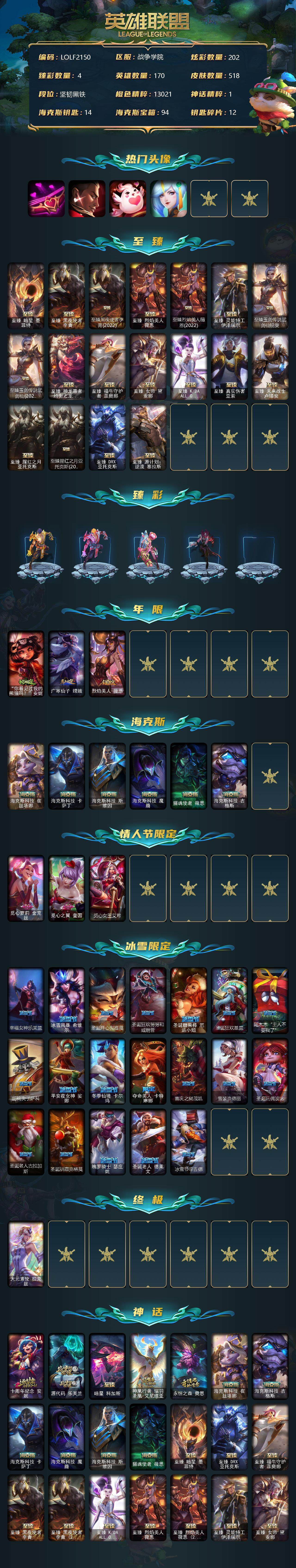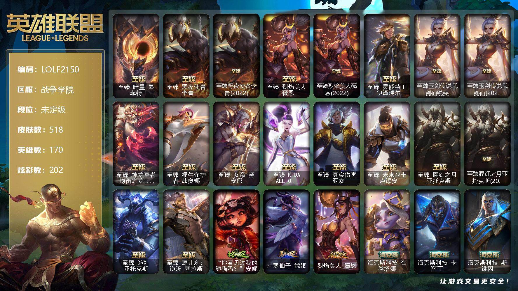 【10852938】【LOLF2150】170英雄/518皮肤/1终极/29神话/71限定/4臻彩/202炫彩/50传说/133史诗/未定级/爱情之歌/觅心游侠卢锡安/爱情鸽/春晖神女/至臻暗星墨菲特/至臻黑夜使者李青/至臻黑夜使者李青(2022)/至臻烈焰美人薇恩/至臻烈焰美人薇恩(2022)/至臻灵能特工伊泽瑞尔/至臻玉剑传说武剑仙/至臻玉剑传说武剑仙(2022)/至臻神龙尊者均衡之龙沃利贝