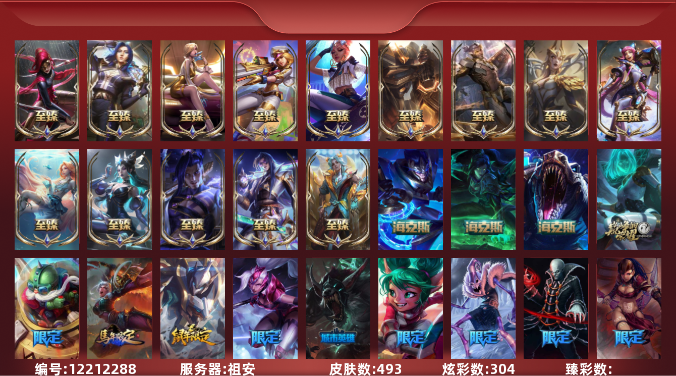 【10853984】[12212288]【gpz_961190】 t27470【祖安】493皮肤 304炫彩 11臻彩 19神话/60限定/58传说/170英雄 账号等级:981 单双排段位:铂金【重要头像】云顶战斗学院伊泽瑞尔 爱意绵绵 觅心之翼奎因 银河魔装机神安妮 救生圈 KDA萨勒芬妮 北极星神黛安娜炫彩 可爱安妮 此志无双羽饰骑士 【重要皮肤】黑色玫瑰假面舞会卡特琳