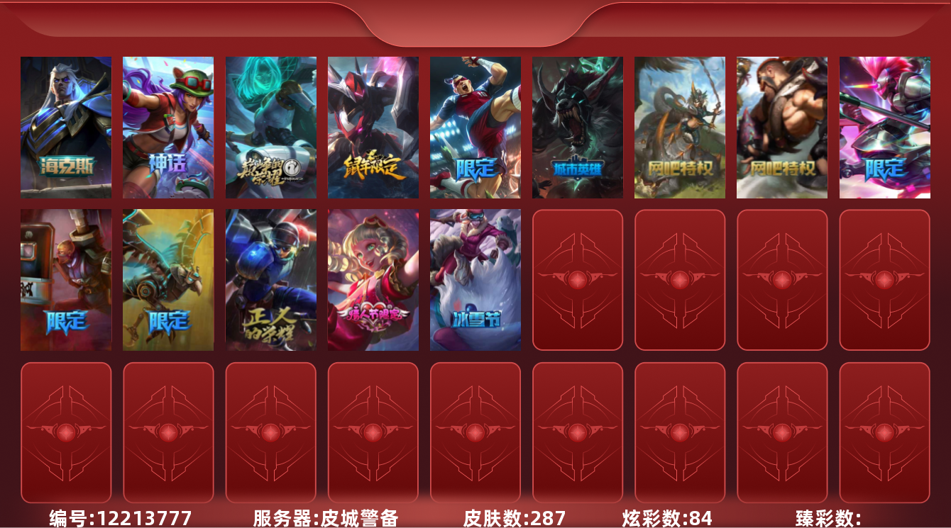 【10854237】[12213777]【gpz_961201】 t27476【皮城警备】287皮肤 84炫彩 9臻彩 5神话/31限定/27传说/171英雄 账号等级:418 单双排段位:黄金【重要头像】爱情之歌 幼犬内瑟斯 灌篮高手诺手炫彩头 【重要皮肤】海克斯科技斯维因 胜利女神娑娜 胜利之王泰达米尔 王国机神朱雀蕾欧娜 胜利女神奥莉安娜 胜利枪神卢锡安 胜利之剑亚托克