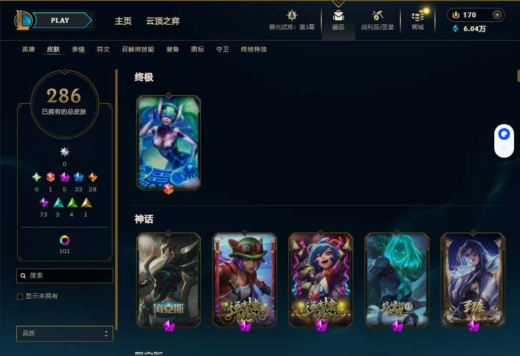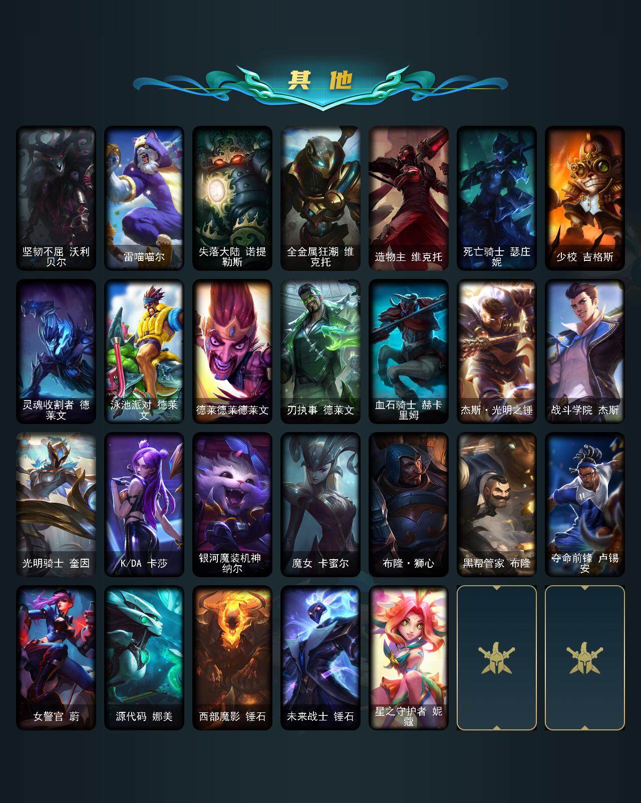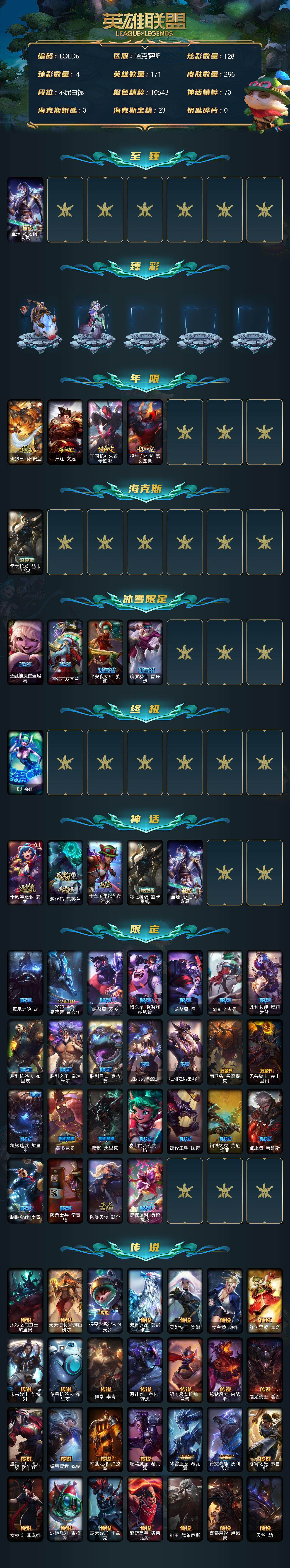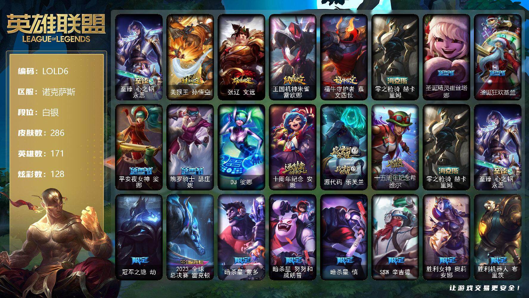 【10859677】【LOLD6】171英雄/286皮肤/1终极/5神话/33限定/4臻彩/128炫彩/28传说/73史诗/白银/至臻心之钢永恩/无畏骑士瑟庄妮赤子初心/魔女阿卡丽虚荣/净雪之月莫甘娜冬虹/红莲之刃锐雯/美猴王孙悟空/张辽文远/王国机神朱雀蕾欧娜/福牛守护者嘉文四世/零之枪骑赫卡里姆/圣诞精灵崔丝塔娜/圣诞狂欢基兰/平安夜女神娑娜/魄罗骑士瑟庄妮/DJ娑娜/十周年纪念安妮/源代码