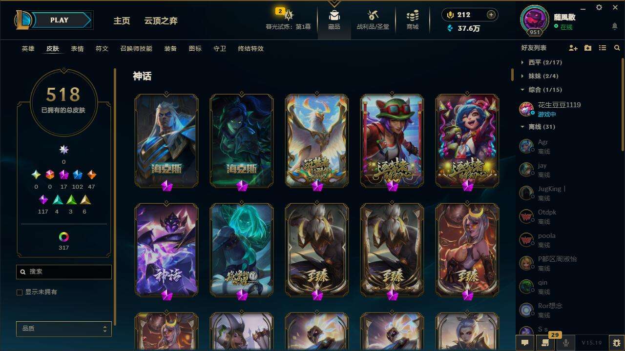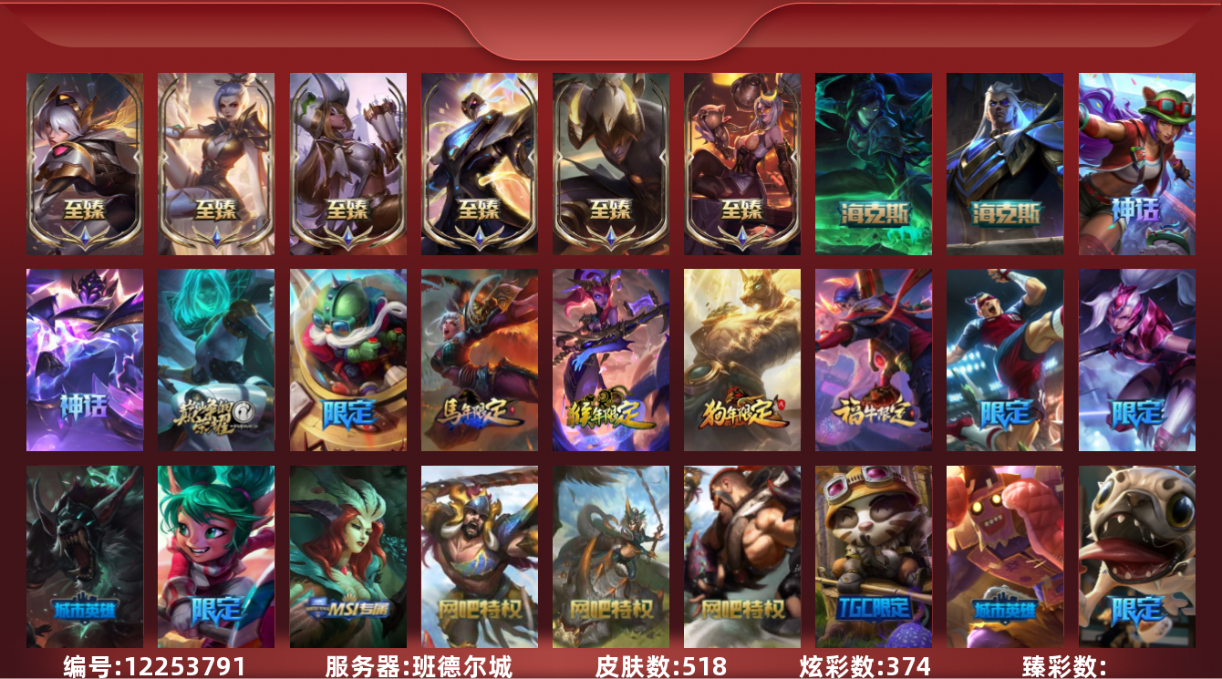 【10863402】[12253791]【gpz_961348】 t27513【班德尔城】518皮肤 374炫彩 16臻彩 17神话/102限定/47传说/171英雄 账号等级:951 单双排段位:铂金【重要头像】爱意绵绵 心型钥匙 泳池派对凯特琳 泳池派对佐伊 万圣节卡特琳娜 阿兰 凯隐飞升影流 星守辛德拉炫彩 幼犬内瑟斯 烈焰美人薇恩炫彩 送披萨的小姐姐希维尔 西部魔