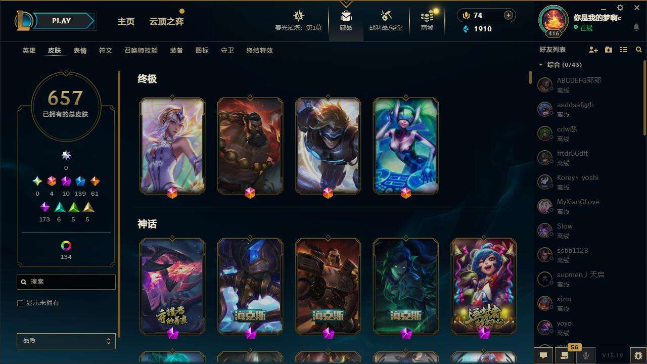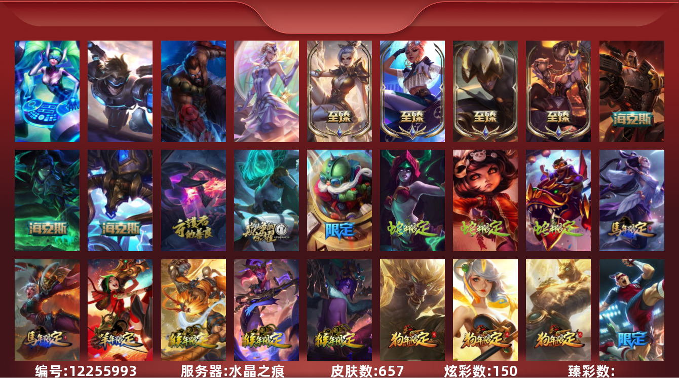 【10864059】[12255993]【gpz_961372】 t27512【水晶之痕】蓝龙瞎 黑龙瞎 657皮肤 150炫彩 14臻彩 10神话/139限定/61传说/160英雄 账号等级:416 【重要头像】至爱的鹿 爱情之歌 春晖神女拉克丝 玉剑传说寒潭夭夭炫彩 万圣节卡特琳娜 幼犬内瑟斯 幼犬沃里克 沐浴震惊 披萨鸡 送披萨的小姐姐希维尔 征服者韦鲁斯 【重要皮