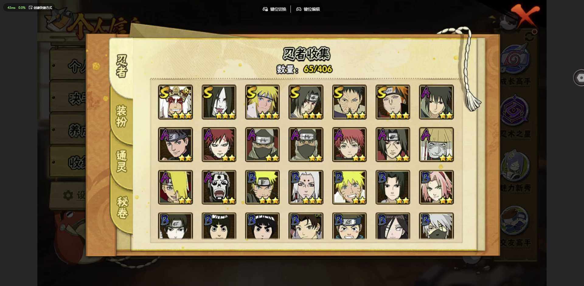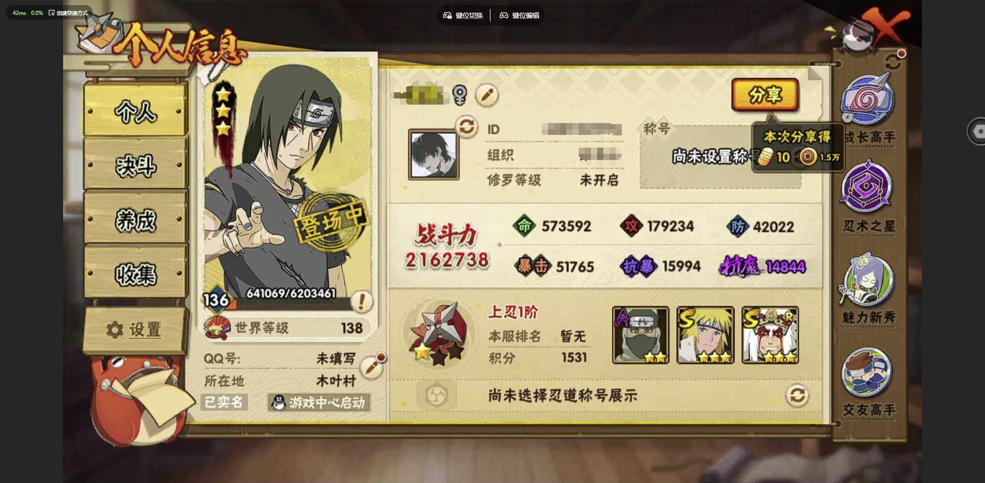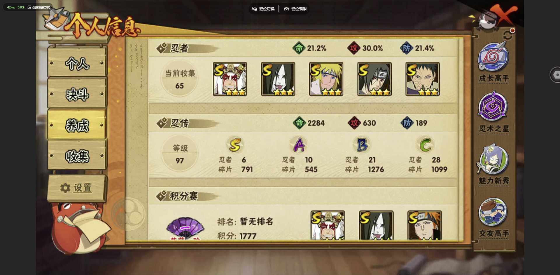 [12256008]: 可修改 贵族等级: V1 S忍数: 6 A忍数: 10 战力值(万): 216 S级忍者: 佩恩「天道」,大蛇丸,波风水门,宇智波鼬 「须佐能乎」,宇智波带土 「忍界大战」,自来也 「舞之豪杰」