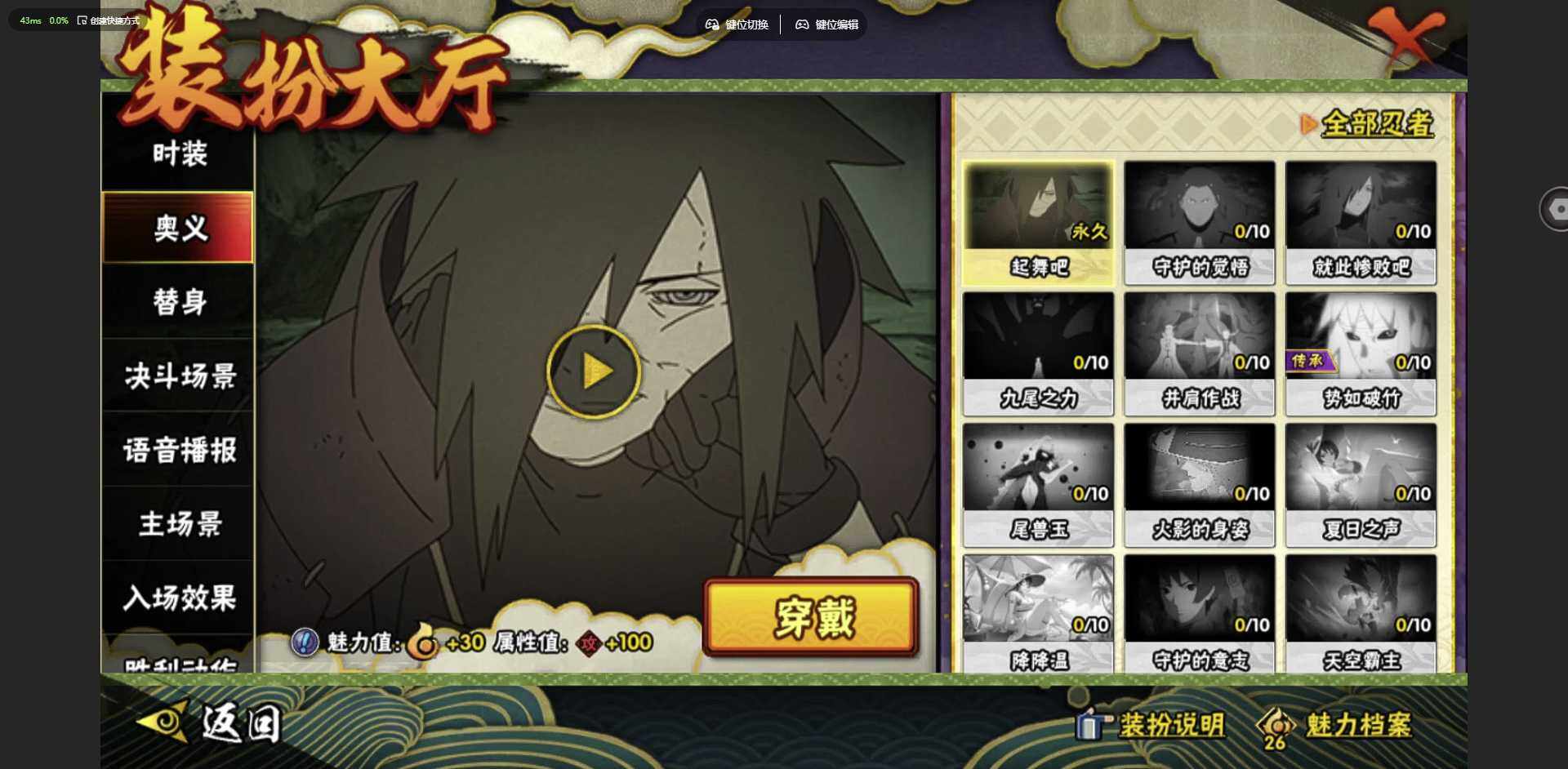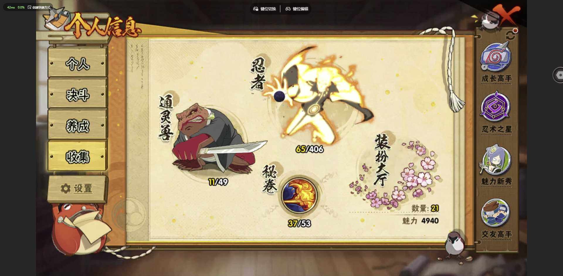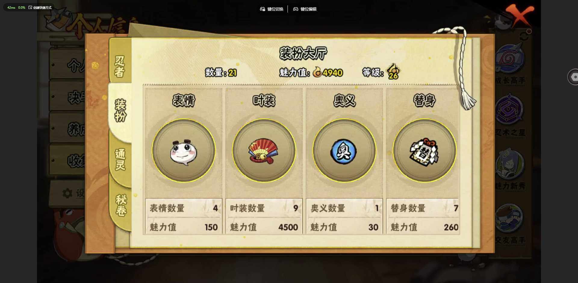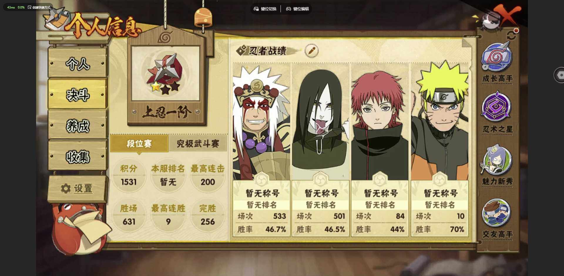 [12256008]: 可修改 贵族等级: V1 S忍数: 6 A忍数: 10 战力值(万): 216 S级忍者: 佩恩「天道」,大蛇丸,波风水门,宇智波鼬 「须佐能乎」,宇智波带土 「忍界大战」,自来也 「舞之豪杰」