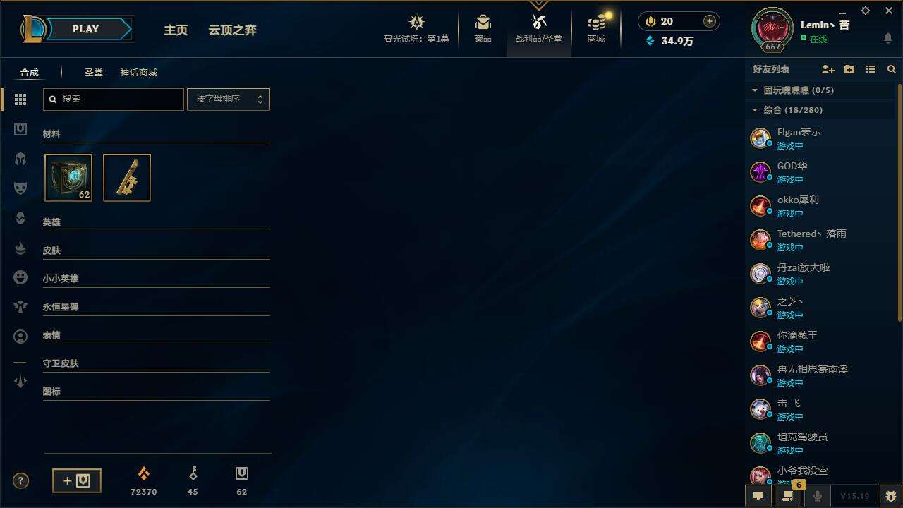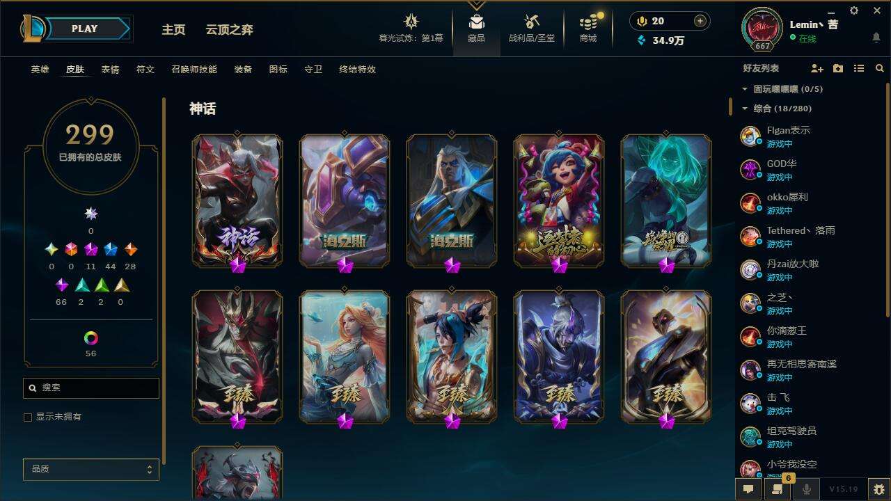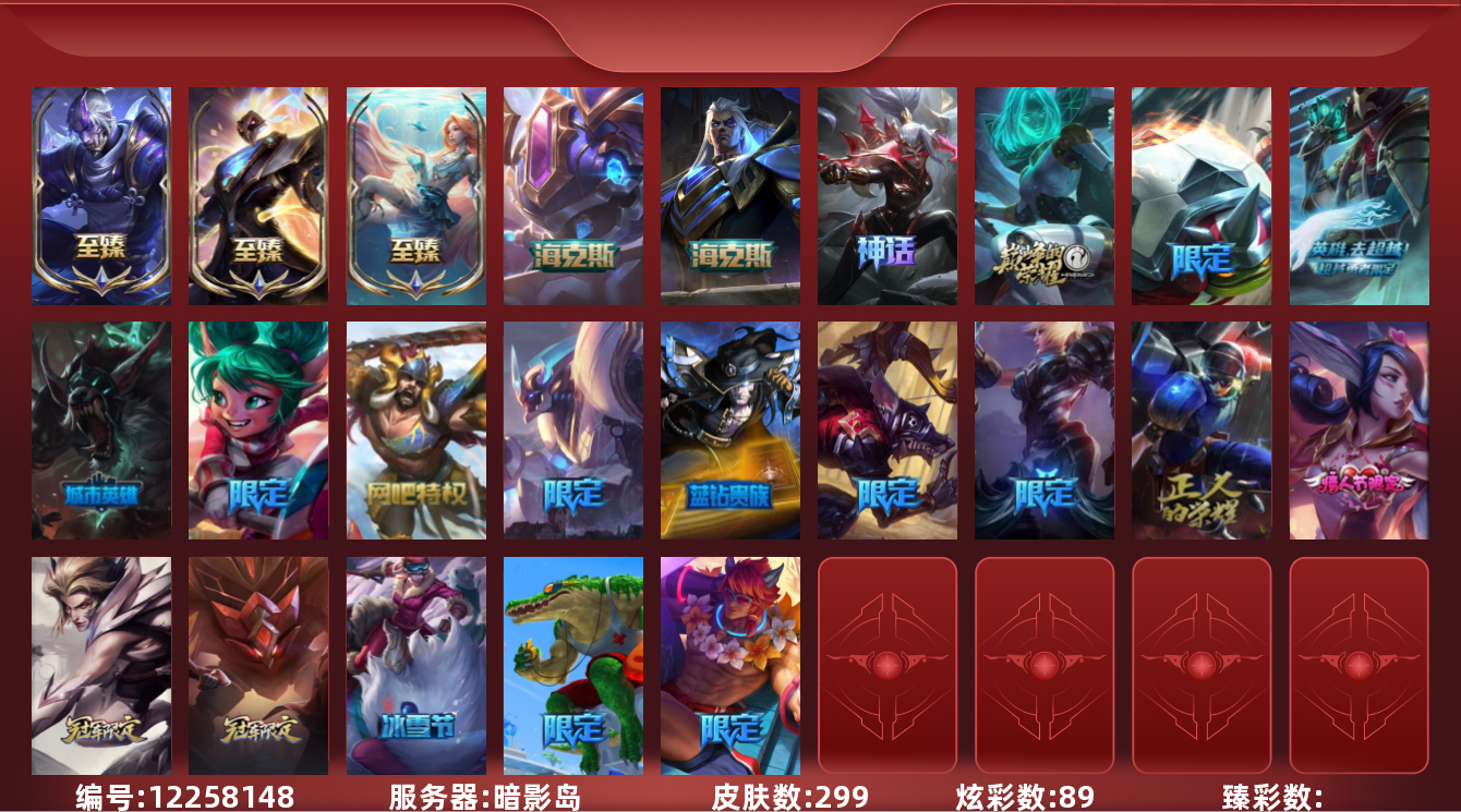 【10864647】[12258148]【gpz_961377】 t27527【暗影岛】原皮龙瞎 299皮肤 89炫彩 9臻彩 11神话/44限定/28传说/171英雄 账号等级:667 单双排段位:黄金【重要头像】我麦是开的么 【重要皮肤】T1塞拉斯至臻 暗裔英雄嘉文四世至臻 莲华温泉厄斐琉斯至臻 灵魂莲华劫至臻 海之歌萨勒芬妮至臻 未来战士锤石至臻 殿堂传奇薇恩 海克斯科技