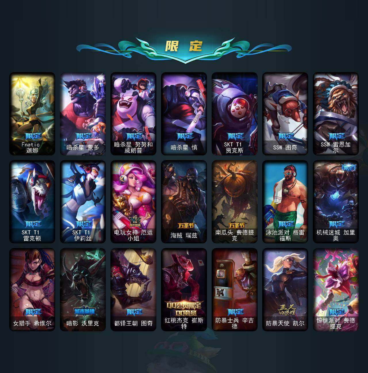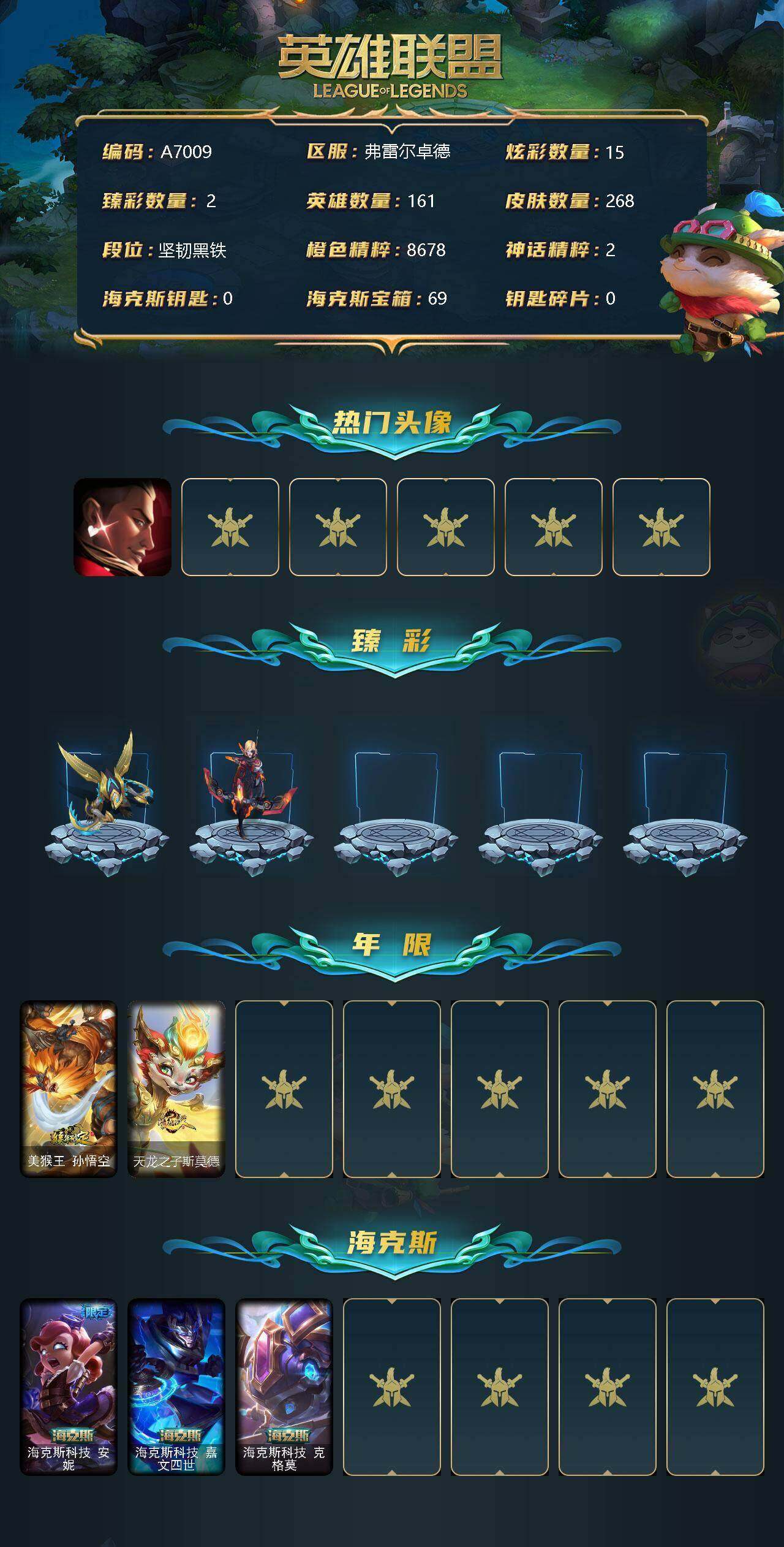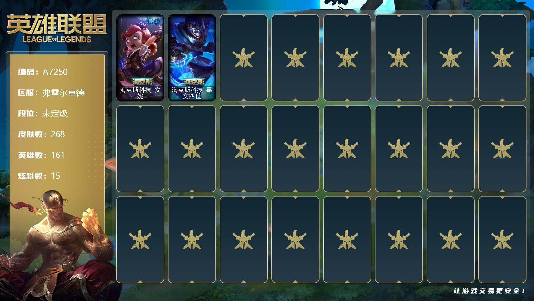 【10864970】[12259503]A7250/可二次/【161英雄-268皮肤-15炫彩-0终极-7神话-38限定-32传说-68史诗】冠军掠夺者卡兹克凯旋圣装,源计划联合艾希红莲之弓/海克斯科技安妮,海克斯科技克格莫/十周年纪念安妮,源代码乐芙兰,暗星科加斯,神凰行者瑞羽圣凰艾尼维亚,海克斯科技安妮,海克斯科技嘉文四世,海克斯科技克格莫/美猴王孙悟空,天龙之子斯莫德/魔幻卡牌崔斯特,战地