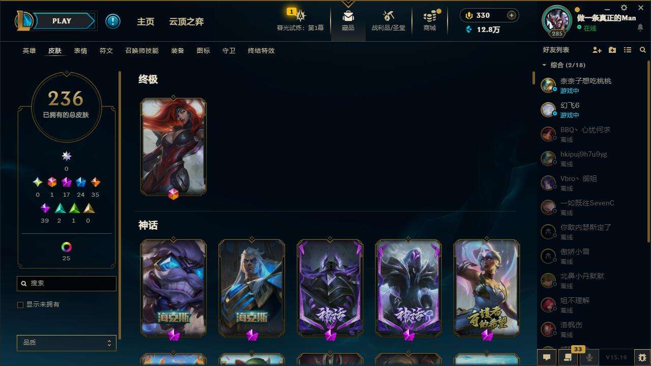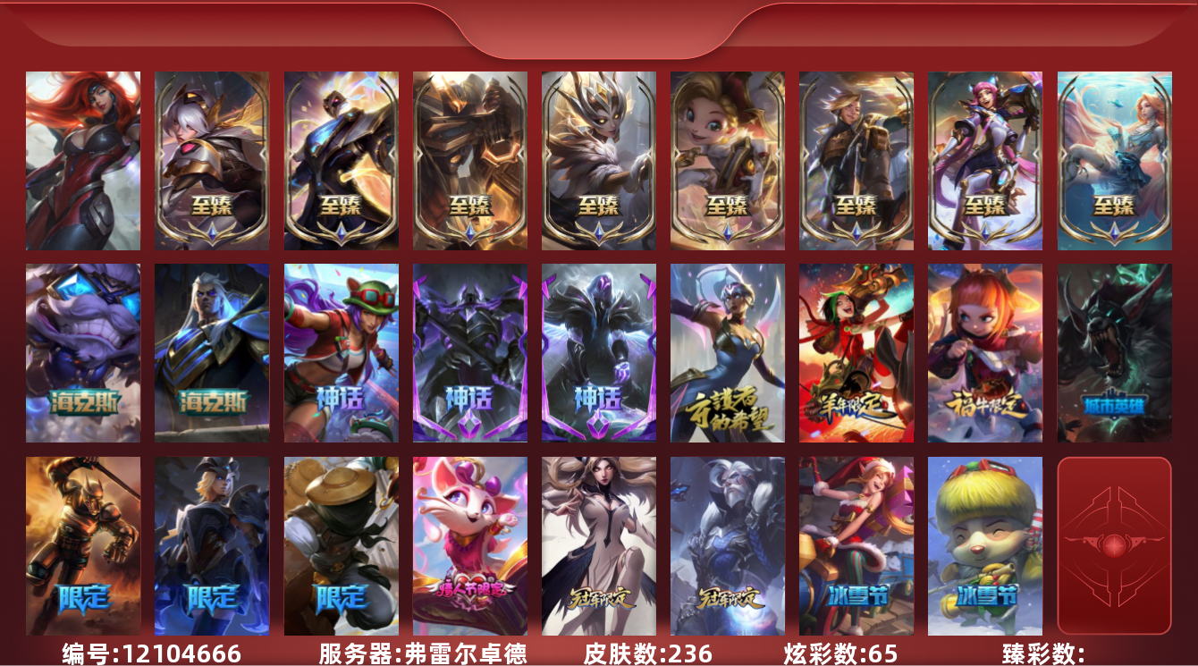 【10865087】[12104666]【gpz_960601】 t27295【弗雷尔卓德】236皮肤 65炫彩 7臻彩 17神话/24限定/35传说/171英雄 账号等级:285 云顶神话:1 【重要头像】击拳 EDG格雷福斯 神龙烈焰金克丝炫彩 战斗学院伊泽瑞尔神话炫彩 不错哦 至臻奥术师佐伊 至臻魔女婕拉 【重要皮肤】T1塞拉斯至臻 暗裔英雄嘉文四世至臻 海之歌萨勒芬