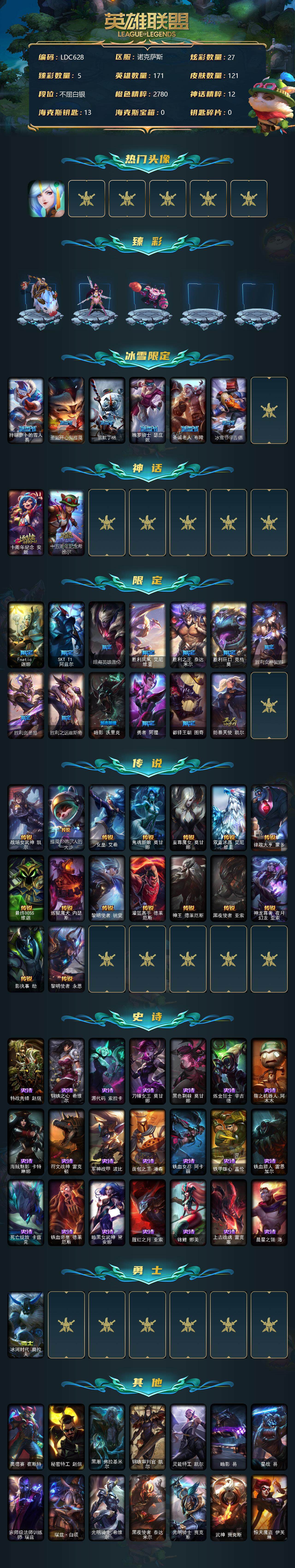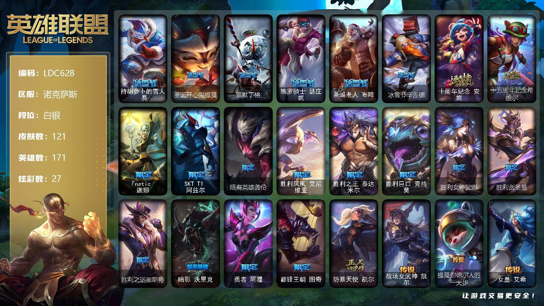 【10865996】【LDC628】171英雄/121皮肤/2神话/19限定/5臻彩/27炫彩/16传说/21史诗/白银/春晖神女/无畏骑士瑟庄妮赤子初心/冠军之刃锐雯2016凯旋圣装/玉剑传说舞剑仙承影/可爱可爱粉红红布里茨/魔女阿卡丽虚荣/持胡萝卜的雪人易/圣诞开心鬼提莫/雪默丁格/魄罗骑士瑟庄妮/圣诞老人布隆/冰雪节辛吉德/十周年纪念安妮/十五周年纪念希维尔/Fnatic迦娜/SKTT1阿