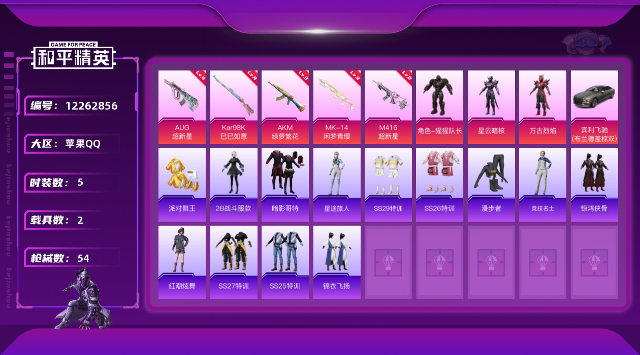 【10866025】【可二次】【苹果QQ】AKM-绿萝繁花 漫步者 AUG-超新星 派对舞王 M416-超新星 M416-黄金龙骨 梦幻火箭飞行器 暗影哥特 AWM-黄金龙骨 忍者信条 MK14-闲梦青缨