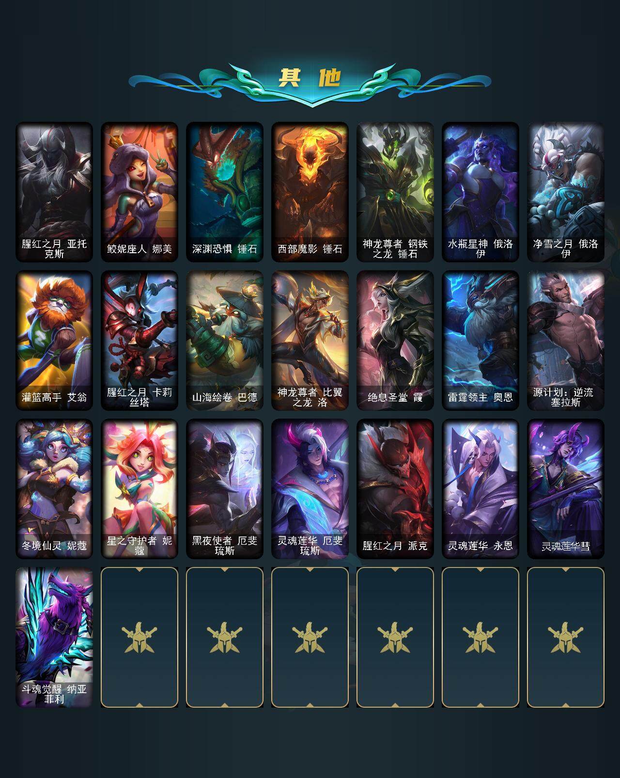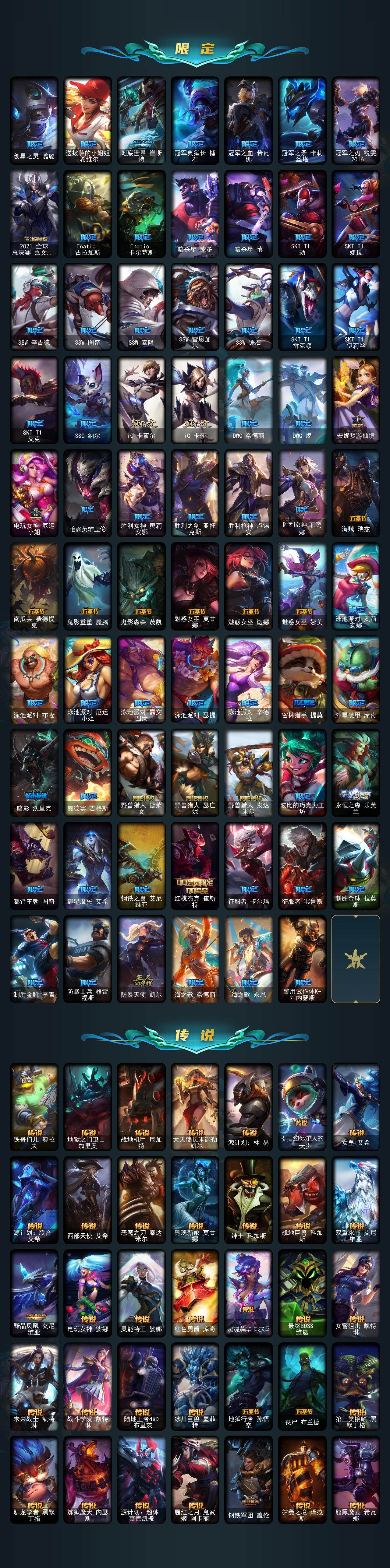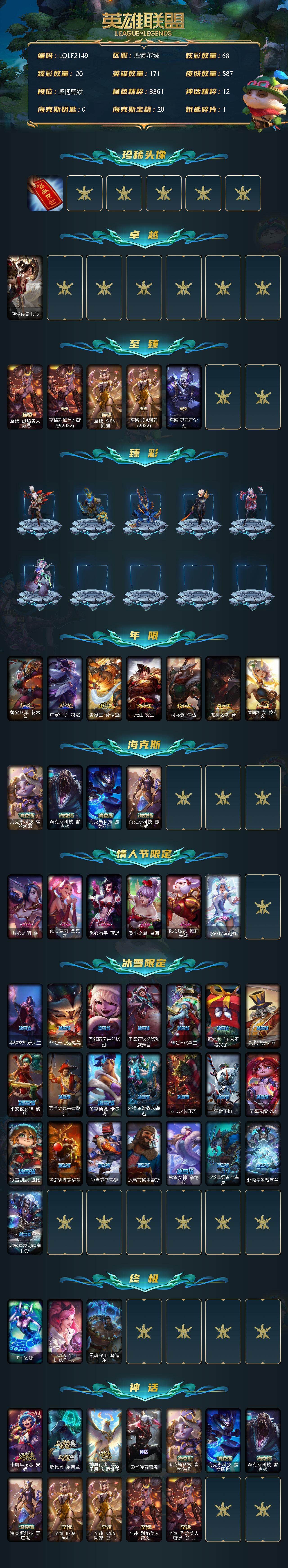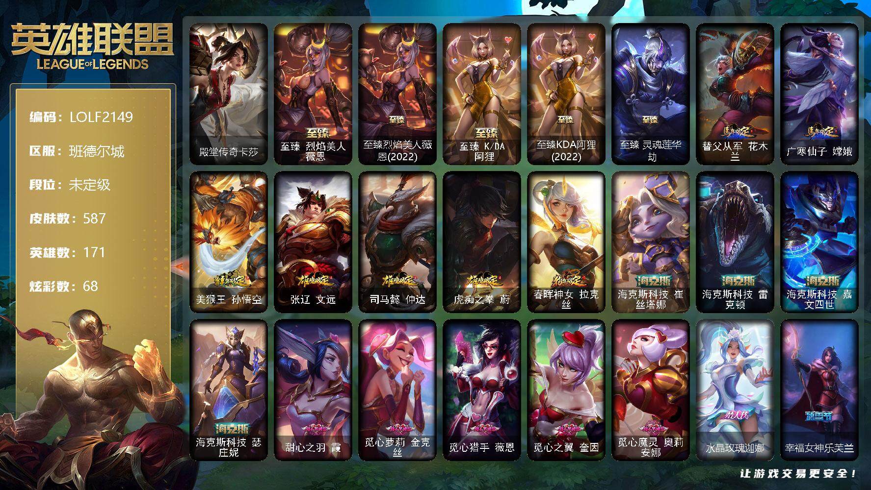 【10867548】【LOLF2149】171英雄/587皮肤/5终极/13神话/104限定/20臻彩/68炫彩/48传说/121史诗/未定级/红包/殿堂传奇卡莎/至臻烈焰美人薇恩/至臻烈焰美人薇恩(2022)/至臻K/DA阿狸/至臻KDA阿狸(2022)/至臻灵魂莲华劫/天龙之子卡莎飞龙乘云/无畏圣弩薇恩绝境狂杀/墨之影武者亚索金墨耀影/冠军典狱长锤石凯旋圣装/真实伤害艾克无畏之志/霸天异形卡