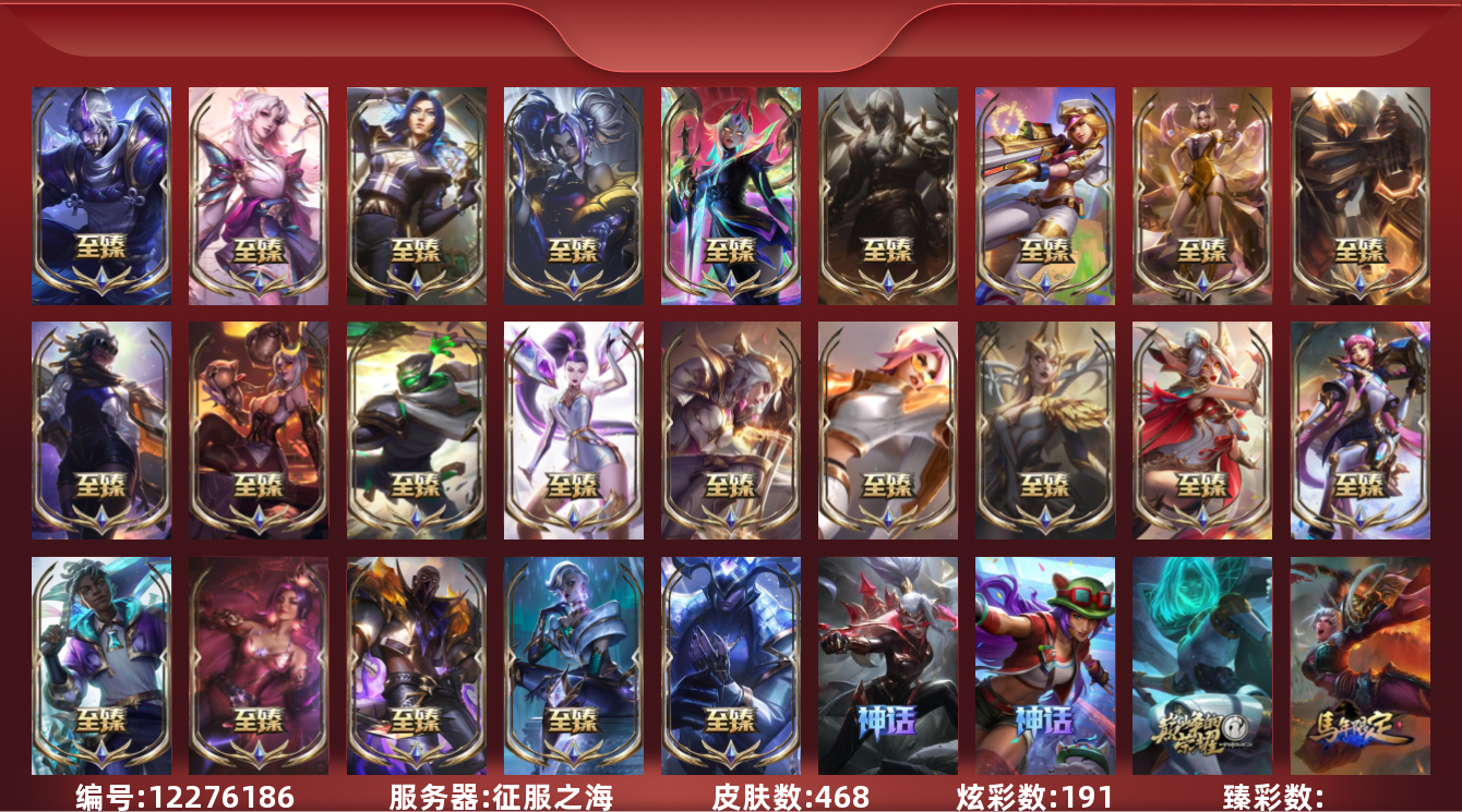 【10868597】[12276186]【gpz_961468】 t27550【征服之海】468皮肤 191炫彩 16臻彩 28神话/63限定/60传说/171英雄 账号等级:306 单双排段位:铂金【重要头像】觅心之翼奎因 春晖神女拉克丝 星守金克丝炫彩 【重要皮肤】灵魂莲华劫至臻 灵魂莲华拉克丝至臻 双城之战2指挥官凯特琳至臻 魔域梦魇泽丽至臻 至高天凯尔至臻 北极星钢影卡