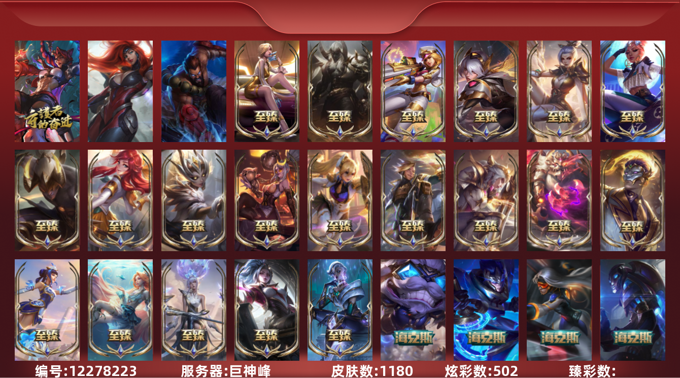 【10869063】[12278223]【gpz_961492】 t27561【巨神峰】原皮龙瞎 1180皮肤 502炫彩 25臻彩 41神话/211限定/104传说/171英雄 账号等级:731 云顶神话:2 单双排段位:翡翠【重要头像】爱意绵绵 爱情之歌 心型钥匙 觅心之翼奎因 拓蛙 雪花 寒格薇 咖啡甜心布偶布罗 咖啡甜心草莓熊熊 咖啡甜心茶杯查理 咖啡甜心茶杯朵尔
