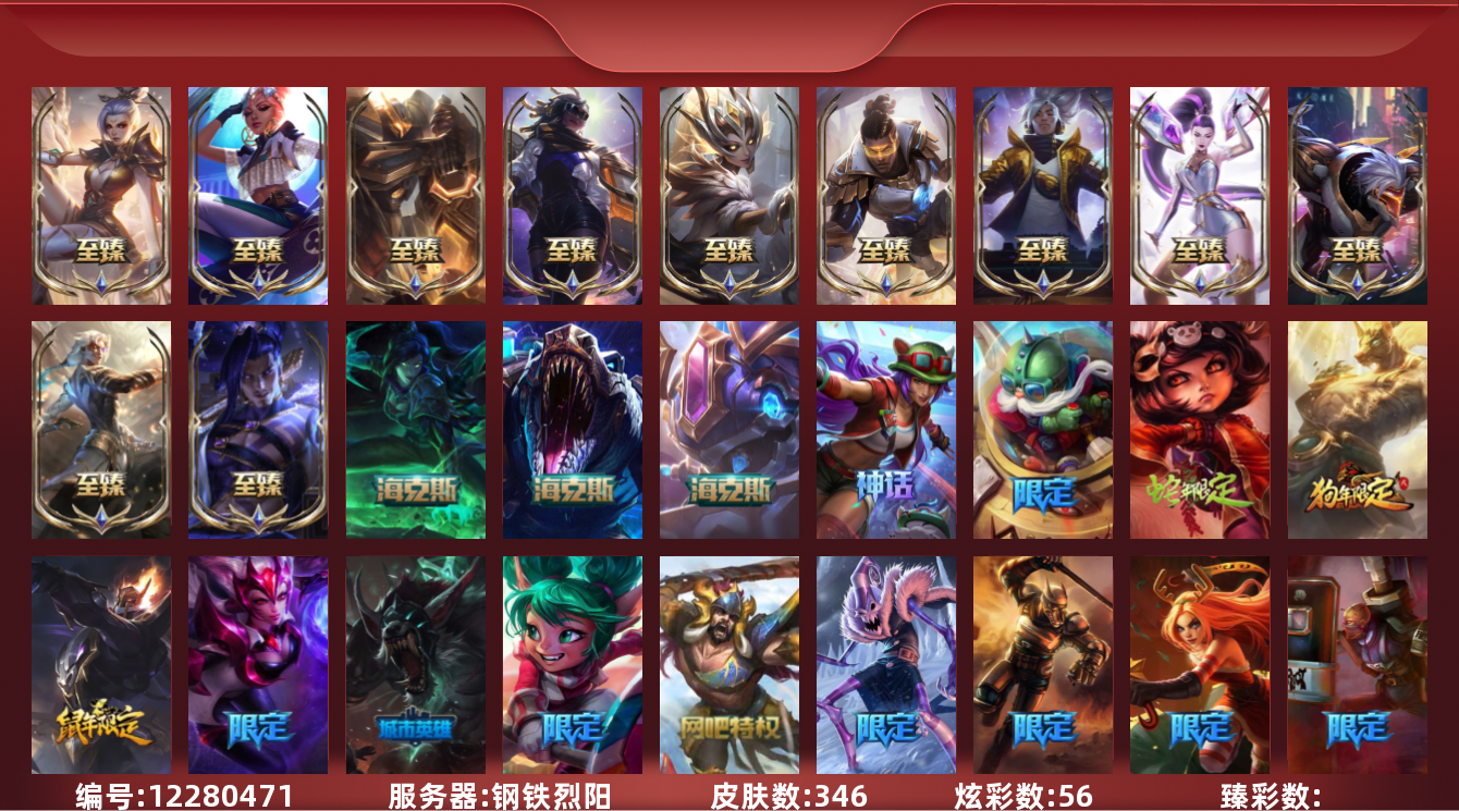 【10869667】[12280471]【gpz_961519】 t27584【钢铁烈阳】346皮肤 56炫彩 4臻彩 17神话/50限定/36传说/171英雄 账号等级:423 单双排段位:翡翠【重要头像】万圣节卡特琳娜 KDA卡莎 至臻KDA卡莎 至臻魔女婕拉 【重要皮肤】至高天奎桑提至臻 魔女婕拉至臻 未来战士卢锡安至臻 真实伤害亚索至臻 真实伤害赛娜至臻 源计划阴劫至