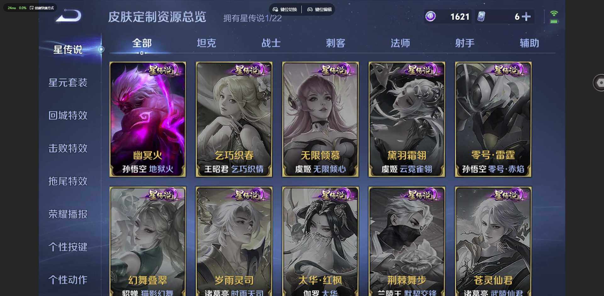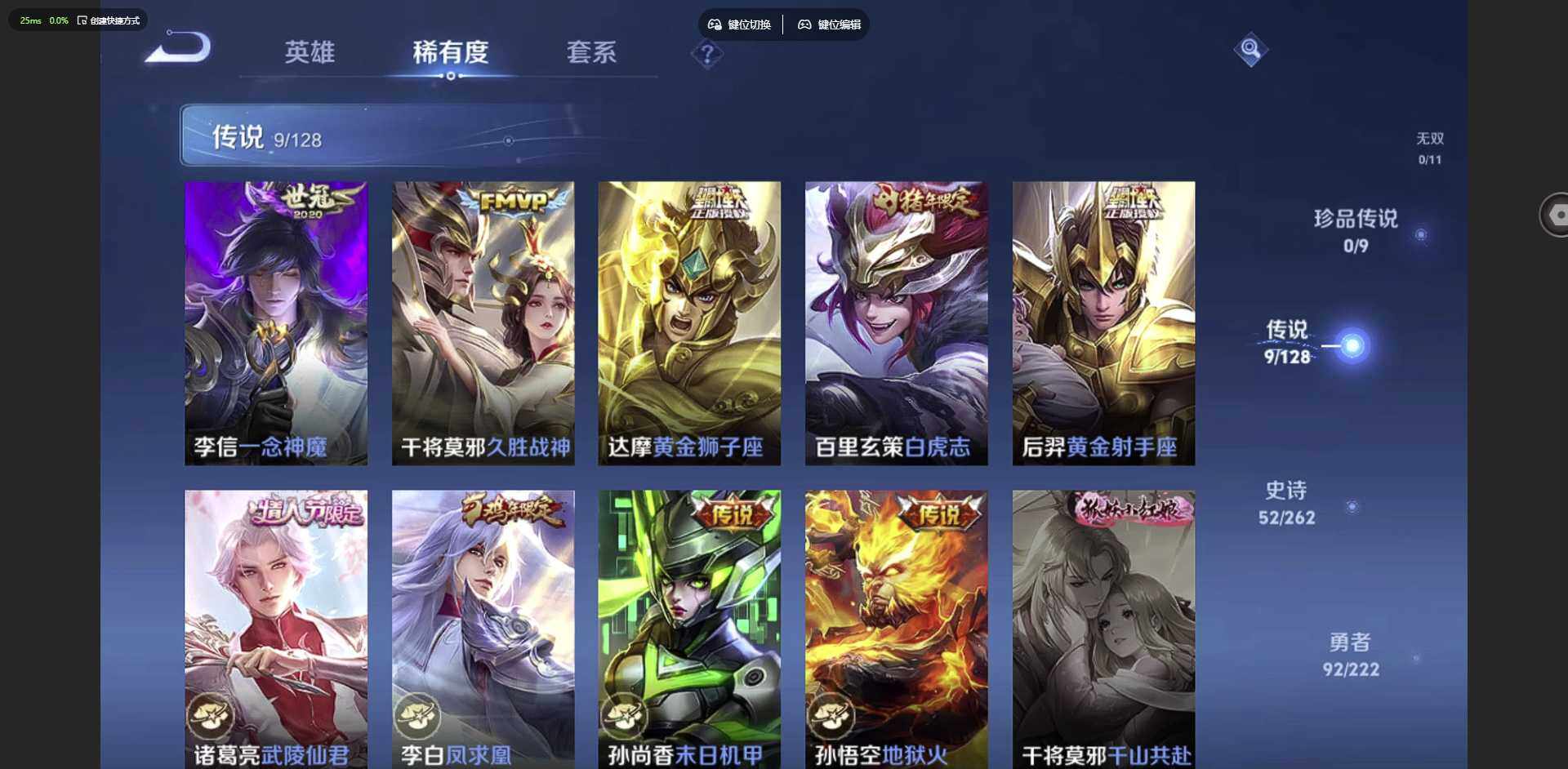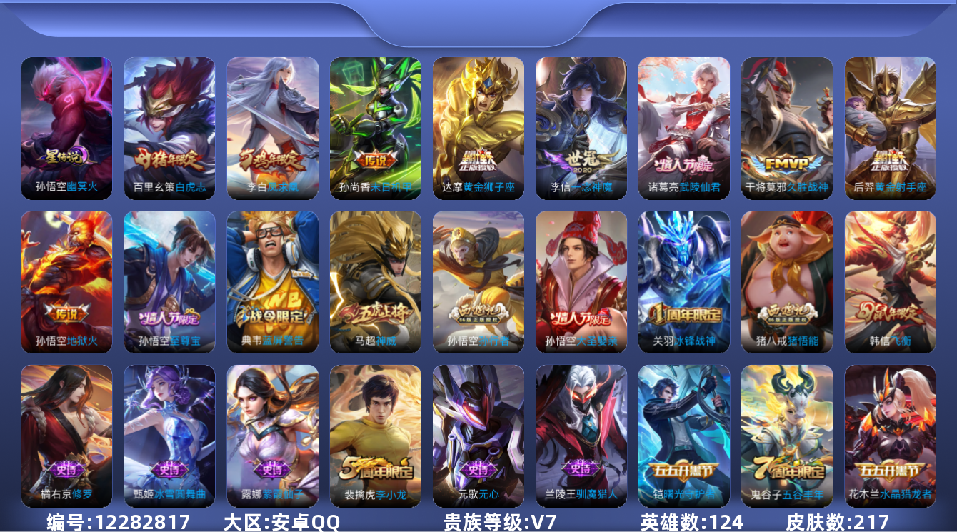 [12282817]: 可修改 贵族等级: V7 英雄数: 124 皮肤数: 217 星传说: 幽冥火 传说皮: 黄金狮子座,黄金射手座,久胜战神,一念神魔,末日机甲-孙尚香,地狱火 限定皮: 冰锋战神,遇见飞天,李小龙,梁祝,神威,飞衡,凤求凰,白虎志,至尊宝,武陵仙君,大圣娶亲,高山流水,孙行者,猪悟能,五谷丰年