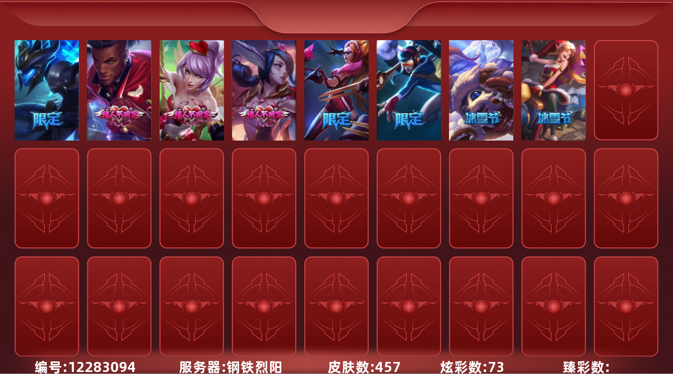 【10870271】[12283094]可二次 可修改实名 3终极 2神话 7臻彩 112限定 37传说 113史诗 457皮肤 73炫彩 160英雄 皮肤:甜心之羽 霞,晨星之翎 洛,永恒之森 巴德,SKT T1 卡莉丝塔,冠军之矛 卡莉丝塔,糖果之王 艾翁,泳池派对 雷克塞,腥红之月 锤石,深渊恐惧 锤石,锦鲤 娜美,狂鲨 亚托克斯,霸天剑魔 亚托克斯,仲裁圣骑 亚托克斯,虎痴之拳 蔚,炼