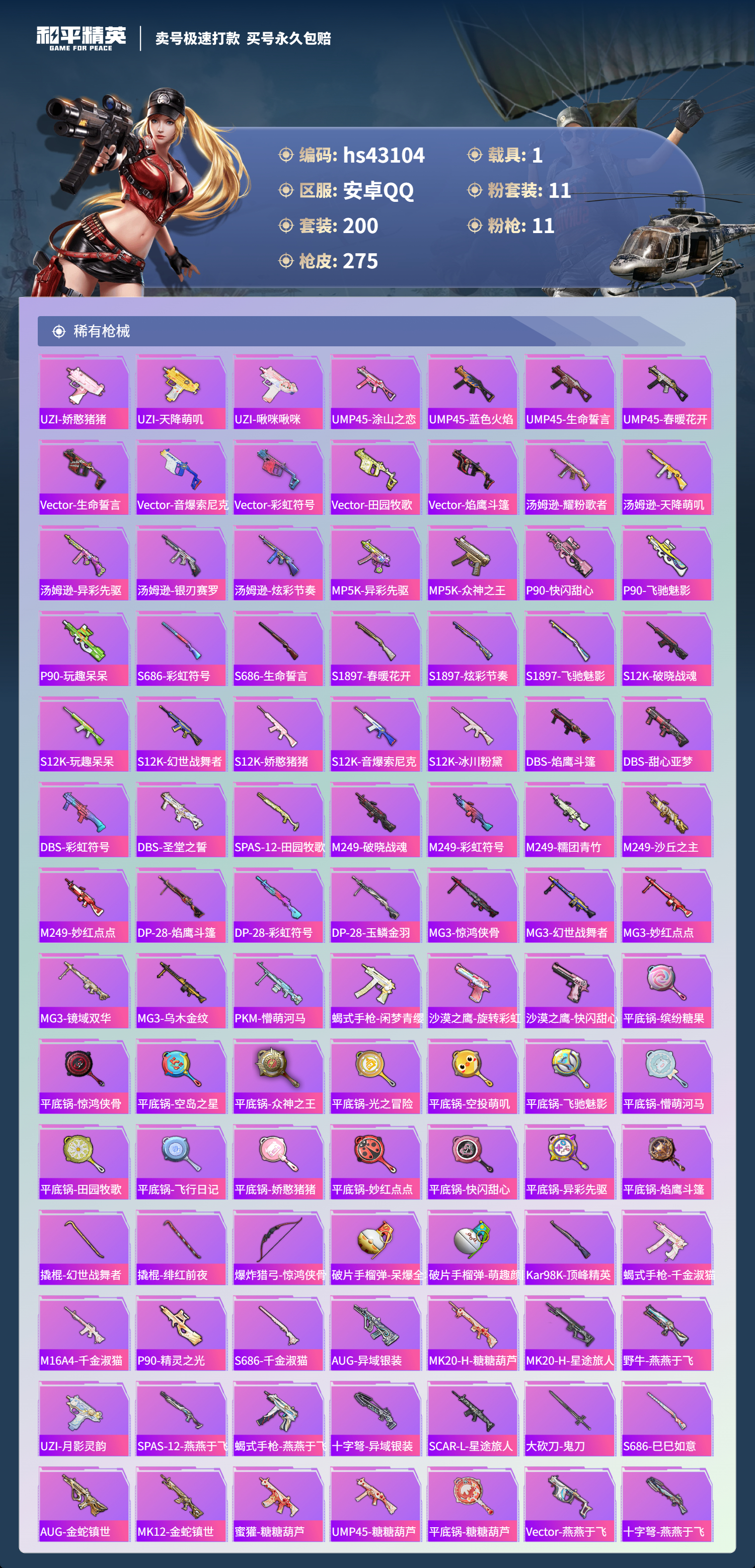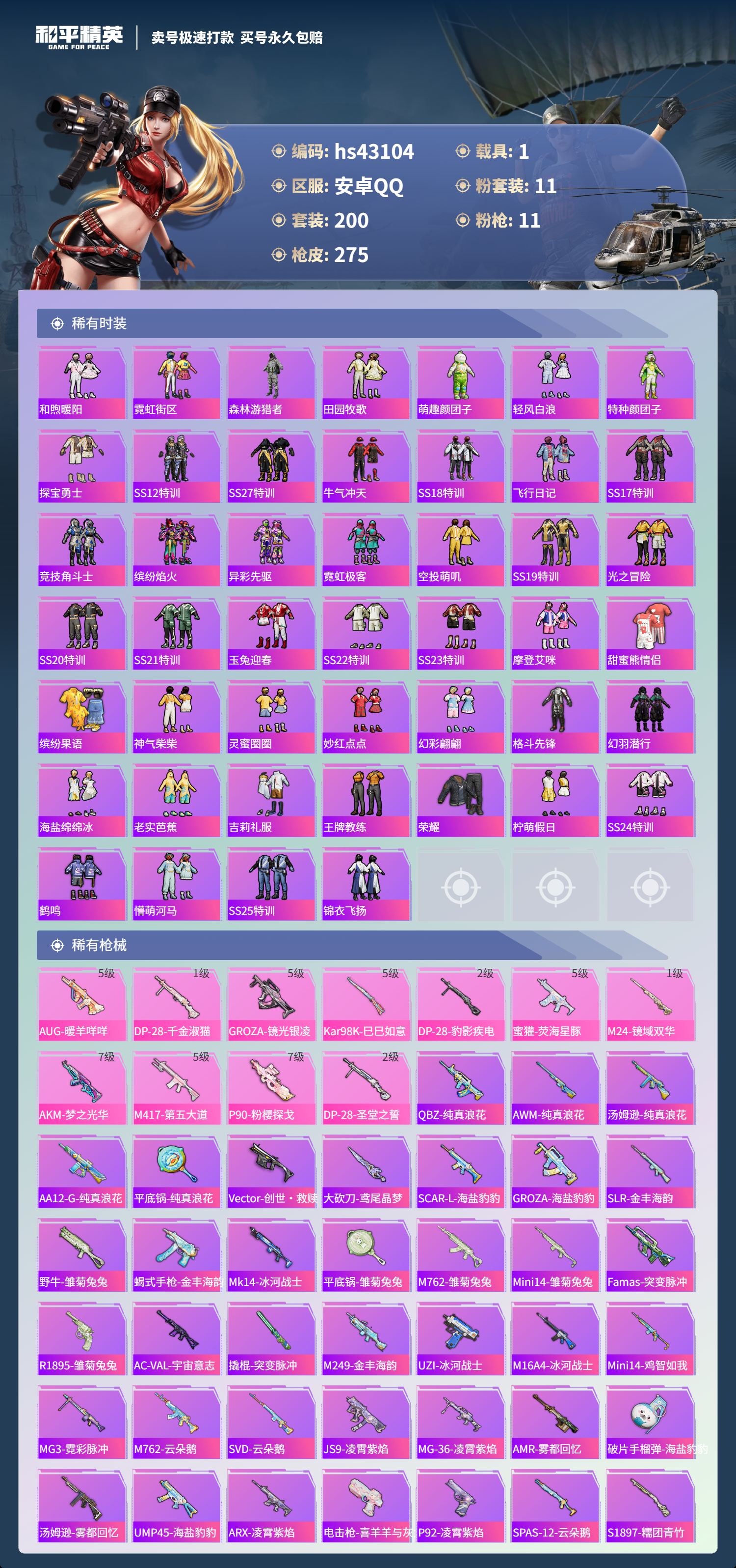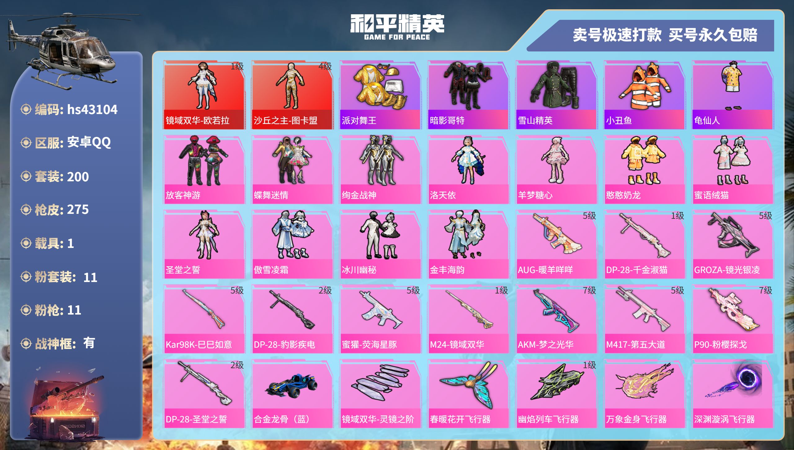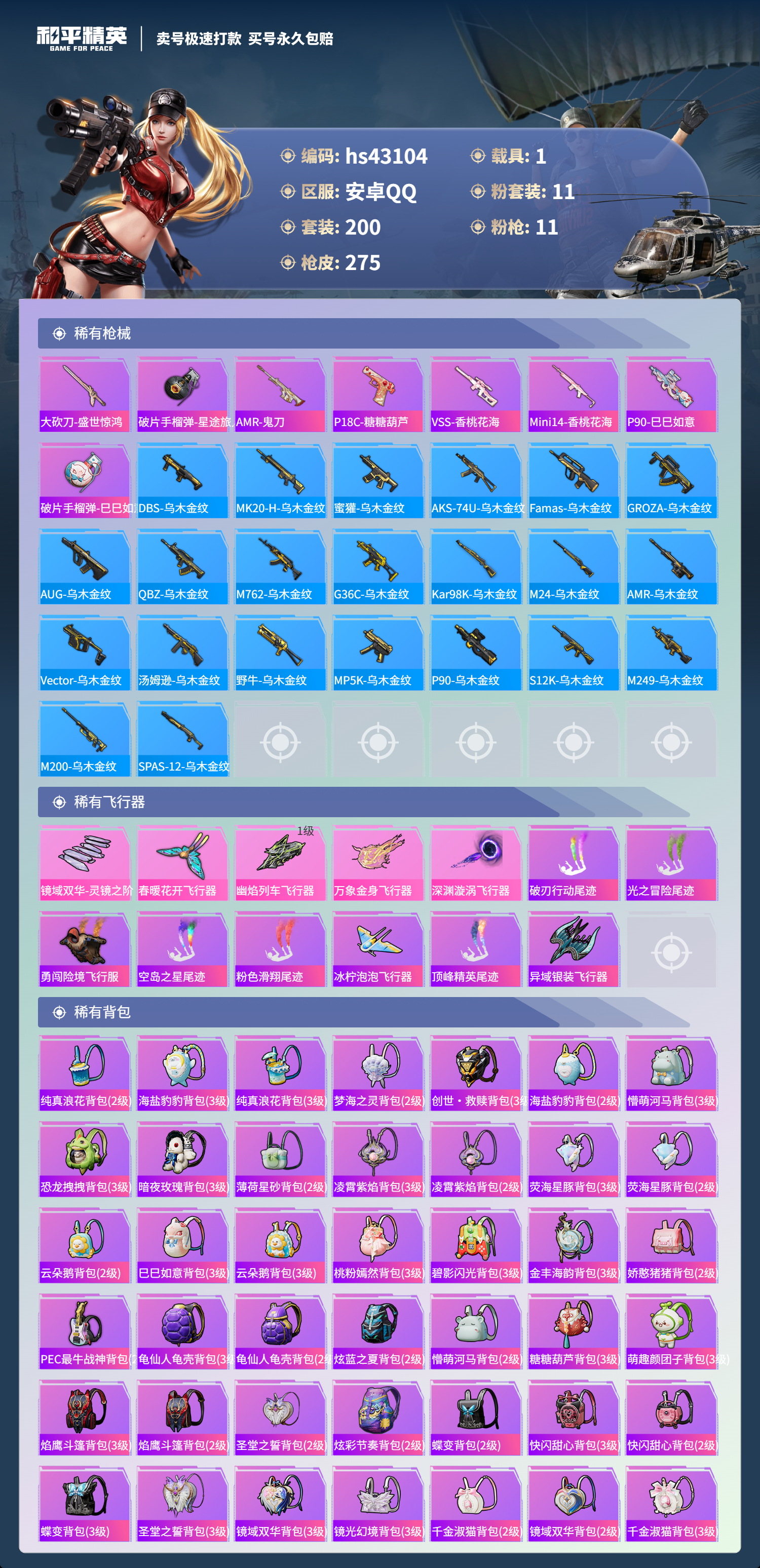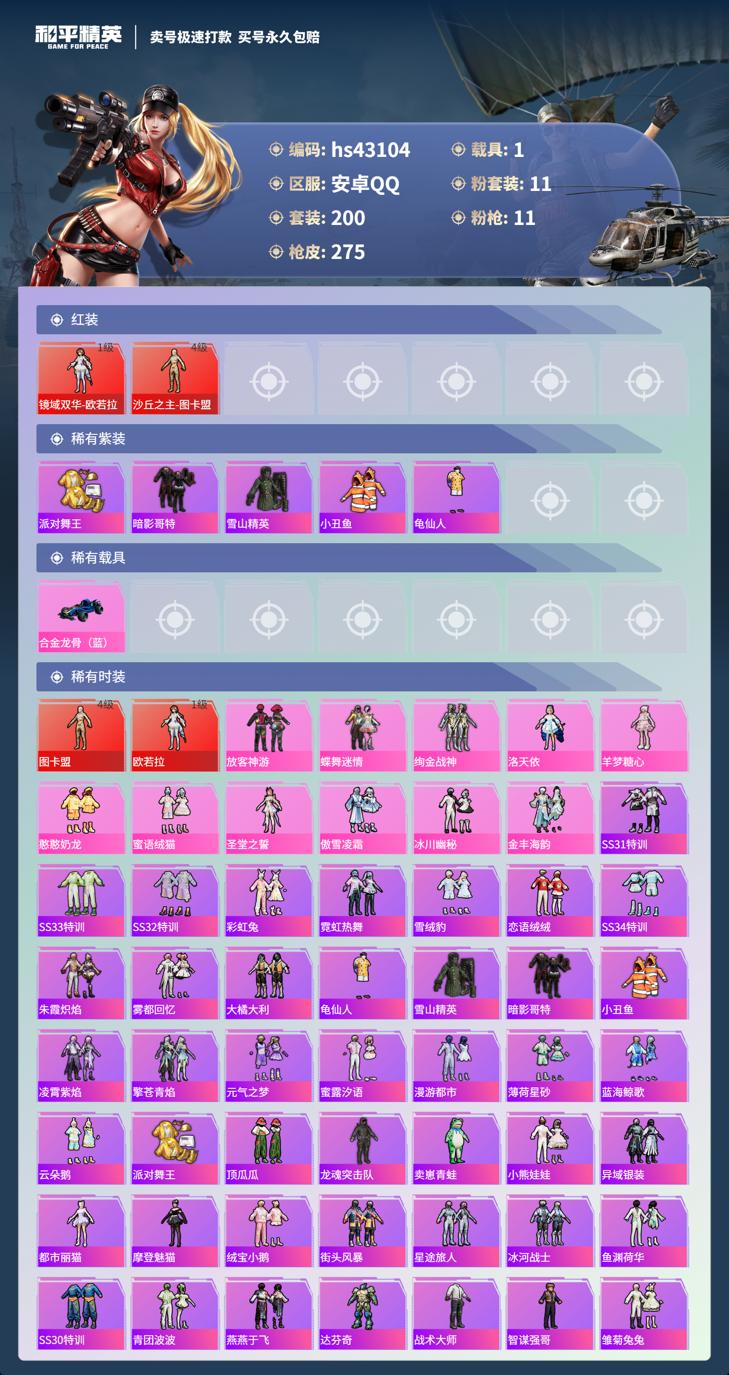 【10871019】【可二次】【安卓QQ】合金龙骨蓝色 龟仙人 M24-镜域双华 绚金战神 漫步者 DP-28-圣堂之誓 洛天依 M417射手步枪 春暖花开飞行器 镜域双华-欧若拉 沙丘之主-图卡盟 放客神游 AKM-梦之光华 AKM-缤纷海域 派对舞王 蝶舞迷情 M417-第五大道 暗影哥特 雪山精英