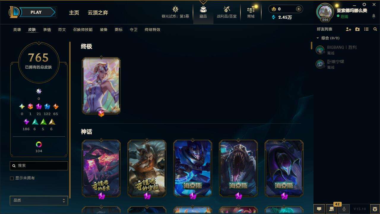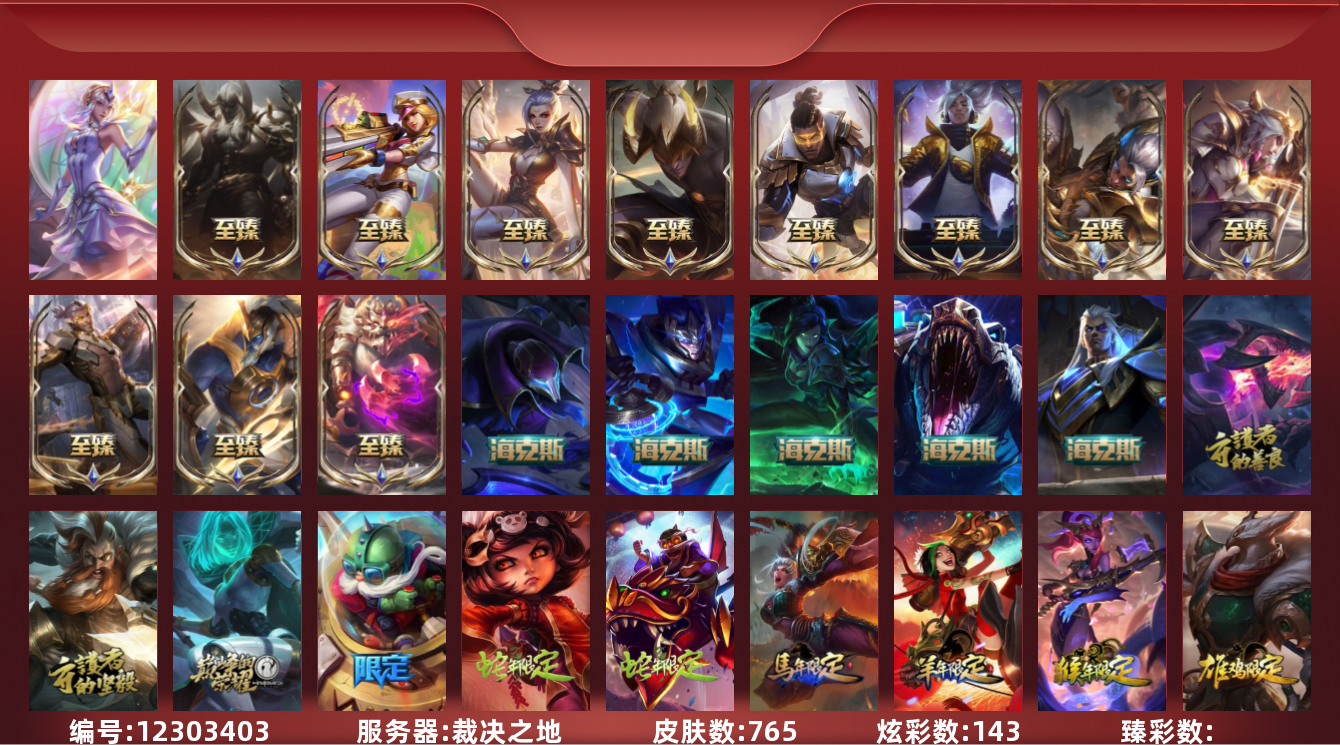 【10875427】[12303403]【gpz_961595】 t27600【裁决之地】原皮龙瞎 765皮肤 143炫彩 14臻彩 21神话/122限定/65传说/171英雄 账号等级:296 单双排段位:白银【重要头像】爱情之歌 救生圈 小斗 SSG伊泽瑞尔 烈焰美人薇恩 【重要皮肤】女帝黛安娜至臻 未来战士卢锡安至臻 真实伤害亚索至臻 源计划逆流塞拉斯至臻 神龙尊者