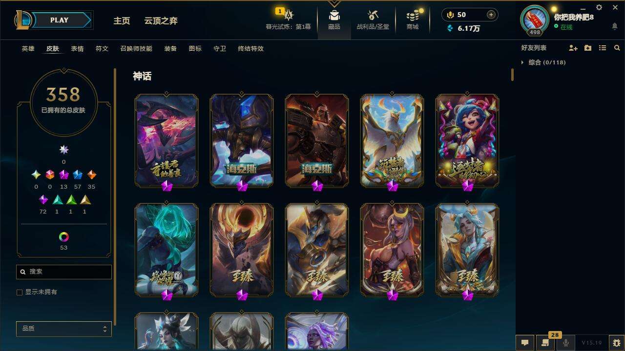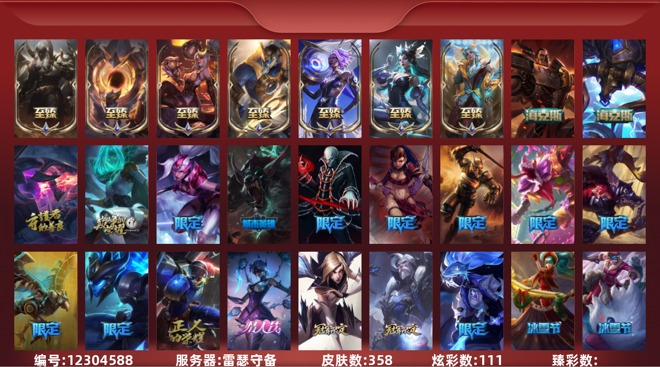 【10875845】[12304588]【gpz_961612】 t27605【雷瑟守备】 358皮肤 111炫彩 11臻彩 13神话/57限定/35传说/171英雄 账号等级:498 单双排段位:黄金【重要头像】爱情之歌 喜庆红包 幼犬内瑟斯 【重要皮肤】天龙之子伊泽瑞尔至臻 星之守护者辛德拉至臻 月蚀骑士赛娜至臻 暗星墨菲特至臻 飞升战神潘森至臻 烈焰美人薇恩至臻 腥红之