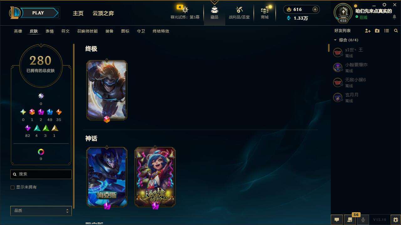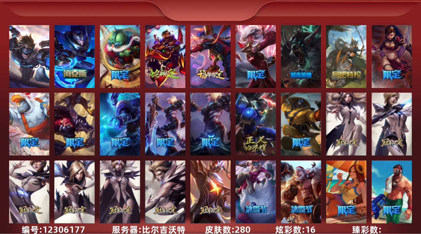 【10876277】[12306177]【gpz_961627】 t27610【比尔吉沃特】280皮肤 16炫彩 1臻彩 2神话/49限定/35传说/161英雄 账号等级:428【重要头像】击拳 战斗学院伊泽瑞尔神话炫彩 【重要皮肤】海克斯科技嘉文四世 胜利女神希维尔 神龙之翼库奇 福牛守护者厄斐琉斯 胜利枪神卢锡安 胜利之剑亚托克斯 圣诞老人布隆 魄罗骑士瑟庄妮 伯爵卡萨
