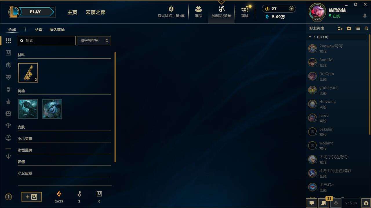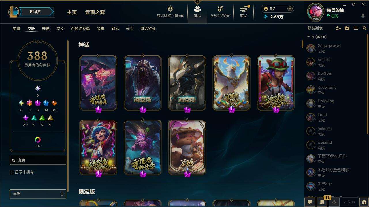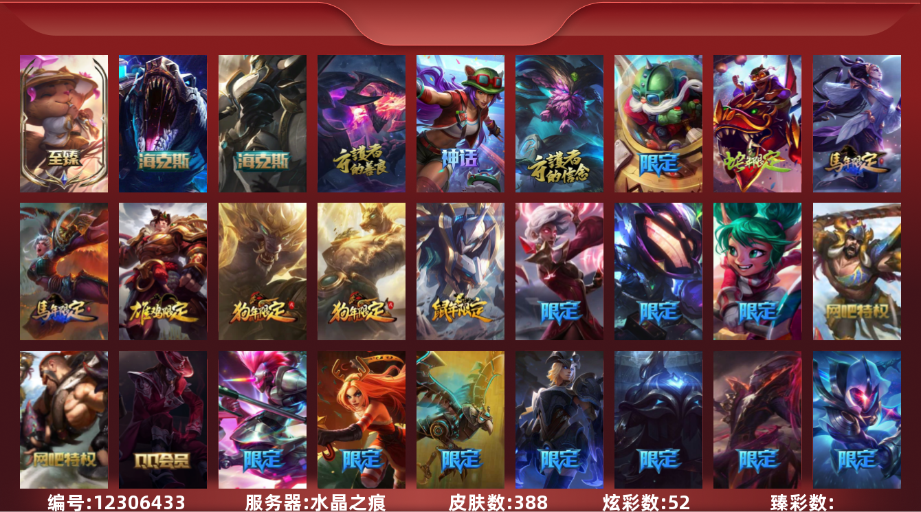 【10876348】[12306433]【gpz_961632】 t27612【水晶之痕】388皮肤 52炫彩 8臻彩 8神话/64限定/38传说/171英雄 账号等级:296 单双排段位:青铜【重要头像】觅心之翼奎因 真实伤害艾克 至臻灵魂莲华提莫 【重要皮肤】灵魂莲华提莫至臻 海克斯科技雷克顿 永恒之森奥恩 暗星科加斯 零之枪骑赫卡里姆 胜利巨口克格莫 黑夜使者弗拉基米尔