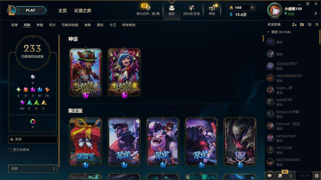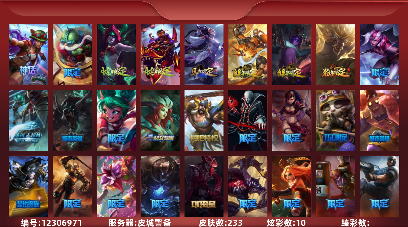 【10876512】[12306971]【gpz_961644】 t27620【皮城警备】原皮龙瞎 233皮肤 10炫彩 1臻彩 2神话/87限定/14传说/137英雄 账号等级:462【重要皮肤】胜利女神希维尔 钢铁军团拉克丝 奥斯曼大帝泰达米尔 勇敢的心德莱厄斯 电玩女神厄运小姐 电玩女神阿狸 龙的传人李青 银龙裁决泰隆 碧玉之牙卡西奥佩娅 古琴余韵娑娜 南天之怒沃里克