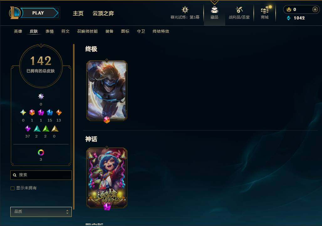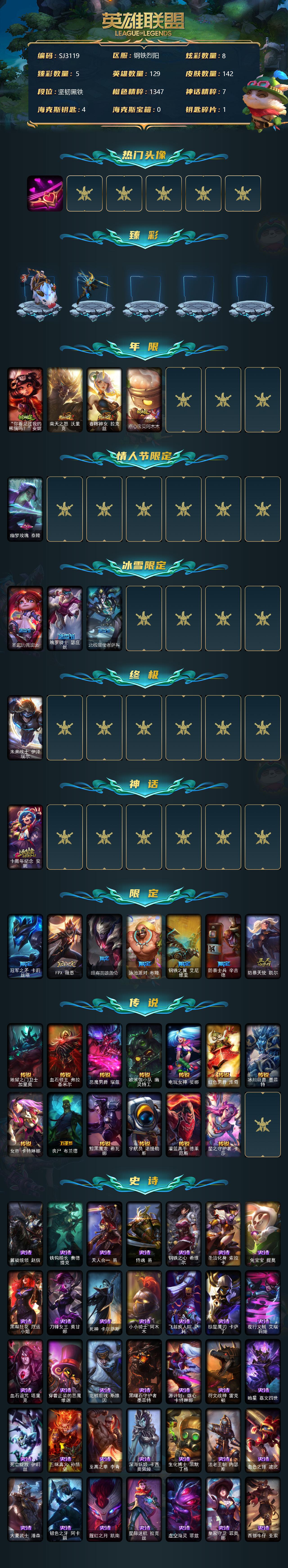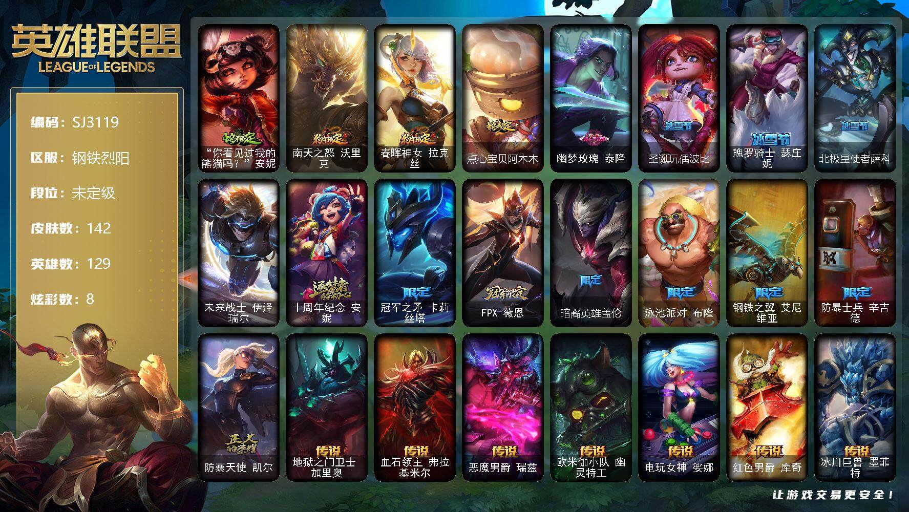 【10878082】【SJ3119】129英雄/142皮肤/1终极/1神话/15限定/5臻彩/8炫彩/13传说/37史诗/未定级账号等级:137/爱情之歌/无畏骑士瑟庄妮赤子初心/冠军之刃锐雯2016凯旋圣装/冠军之矛卡莉丝塔凯旋圣装/幻灵战斗蝠薇恩梦幻强袭/魔女阿卡丽虚荣/“你看见过我的熊猫吗?”安妮/南天之怒沃里克/春晖神女拉克丝/点心宝贝阿木木/幽梦玫瑰泰隆/圣诞玩偶波比/魄罗骑士瑟庄妮/
