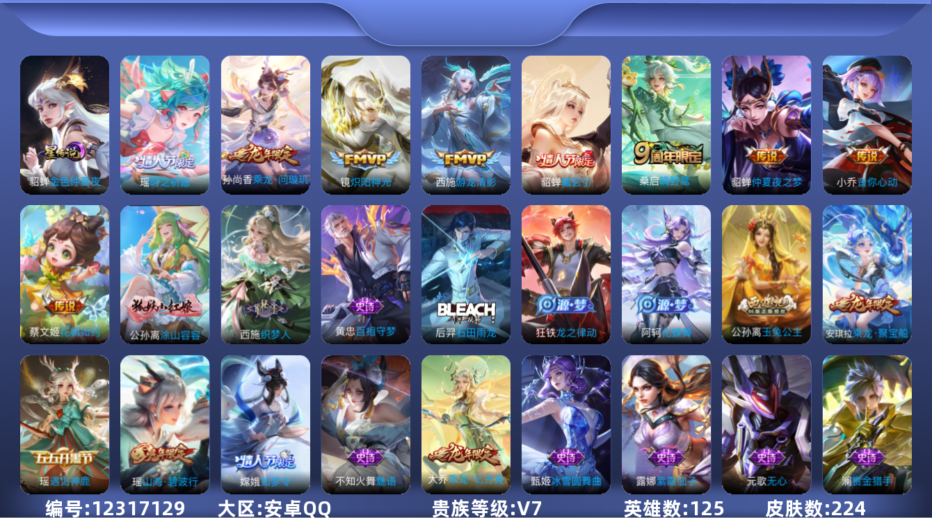 [12317129]【妹子小号 妹子号 瑶妹!!】贵族等级: V7 英雄数: 125 皮肤数: 224 星传说: 金色仲夏夜 传说皮: 炽阳神光,仲夏夜之梦,音你心动-小乔,游龙清影,花朝如约,乘龙·问璇玑,貂蝉曦玄引 限定皮: 梁祝,如梦令-嫦娥,时之祈愿-瑶,玉兔公主,五谷丰年,神器·万象笔,山海·碧波行,鸣野蒿