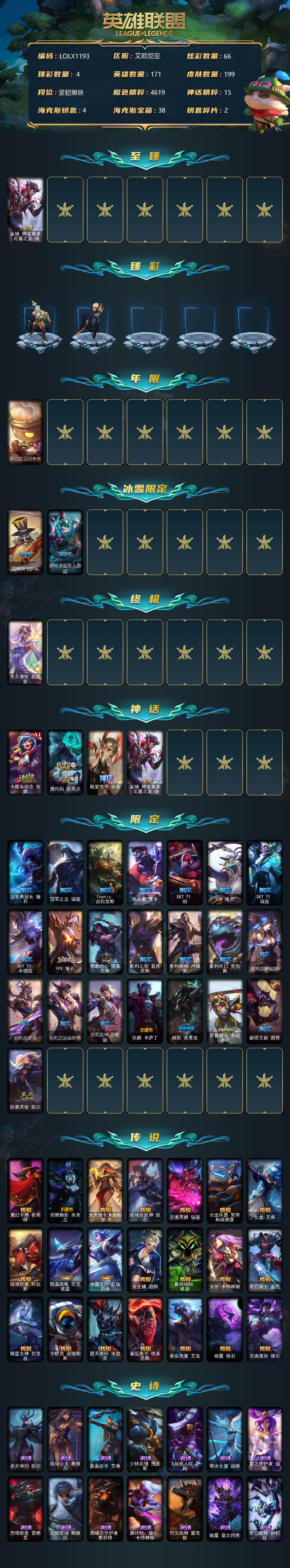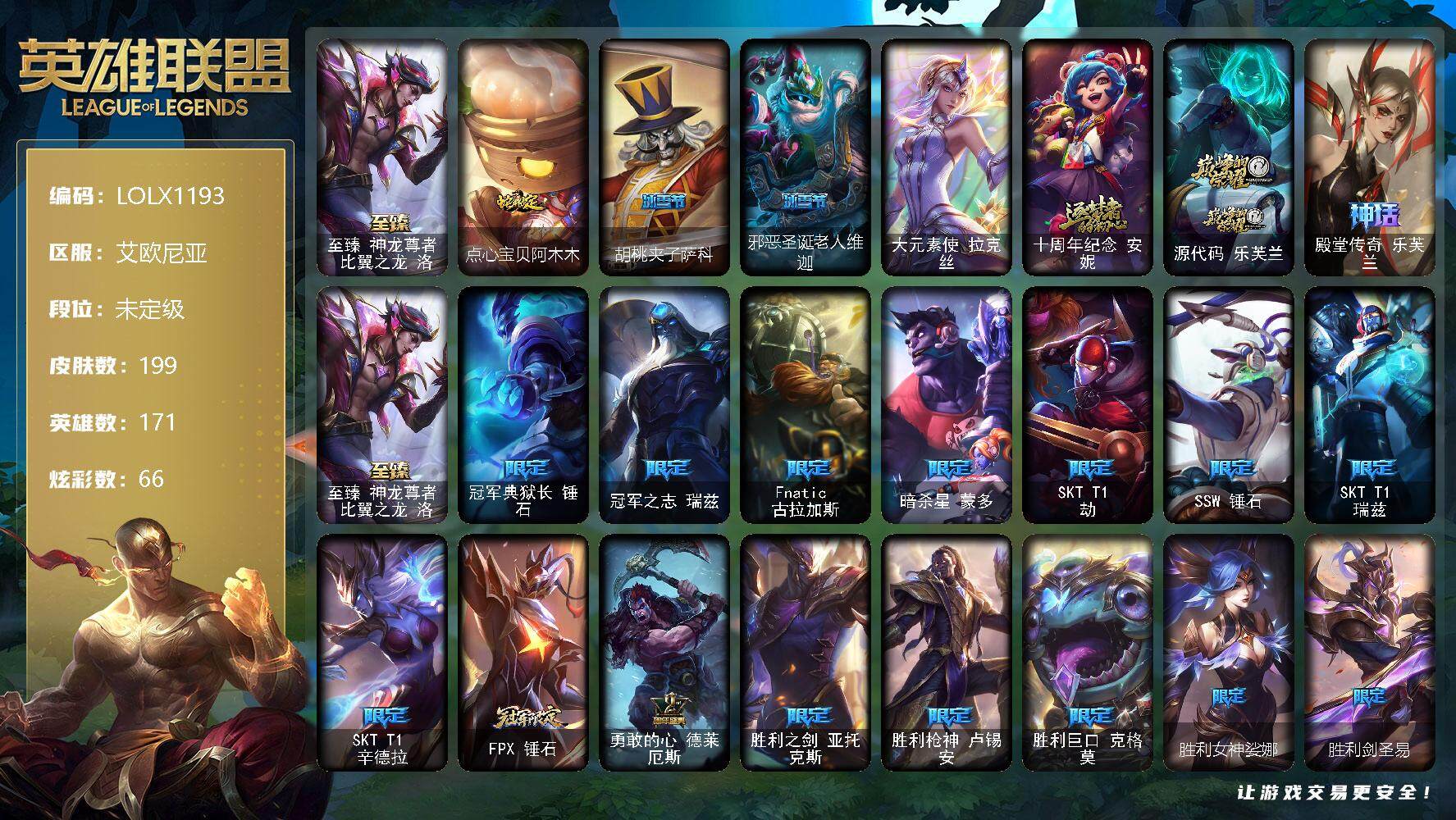 【10879865】【LOLX1193】171英雄/199皮肤/1终极/4神话/25限定/4臻彩/66炫彩/21传说/40史诗/未定级/至臻神龙尊者比翼之龙洛/冠军之志瑞兹凯旋圣装/源计划火菲奥娜惩戒/殿堂传奇乐芙兰登神/魔女阿卡丽虚荣/点心宝贝阿木木/胡桃夹子萨科/邪恶圣诞老人维迦/大元素使拉克丝/十周年纪念安妮/源代码乐芙兰/殿堂传奇乐芙兰/冠军典狱长锤石/冠军之志瑞兹/Fnatic古拉加斯