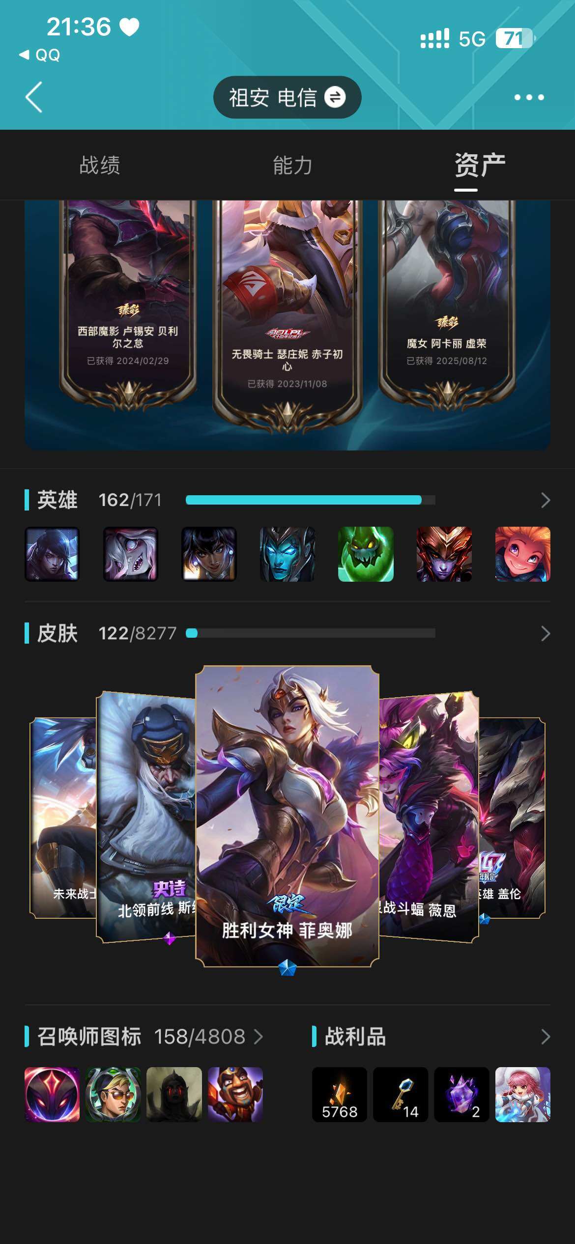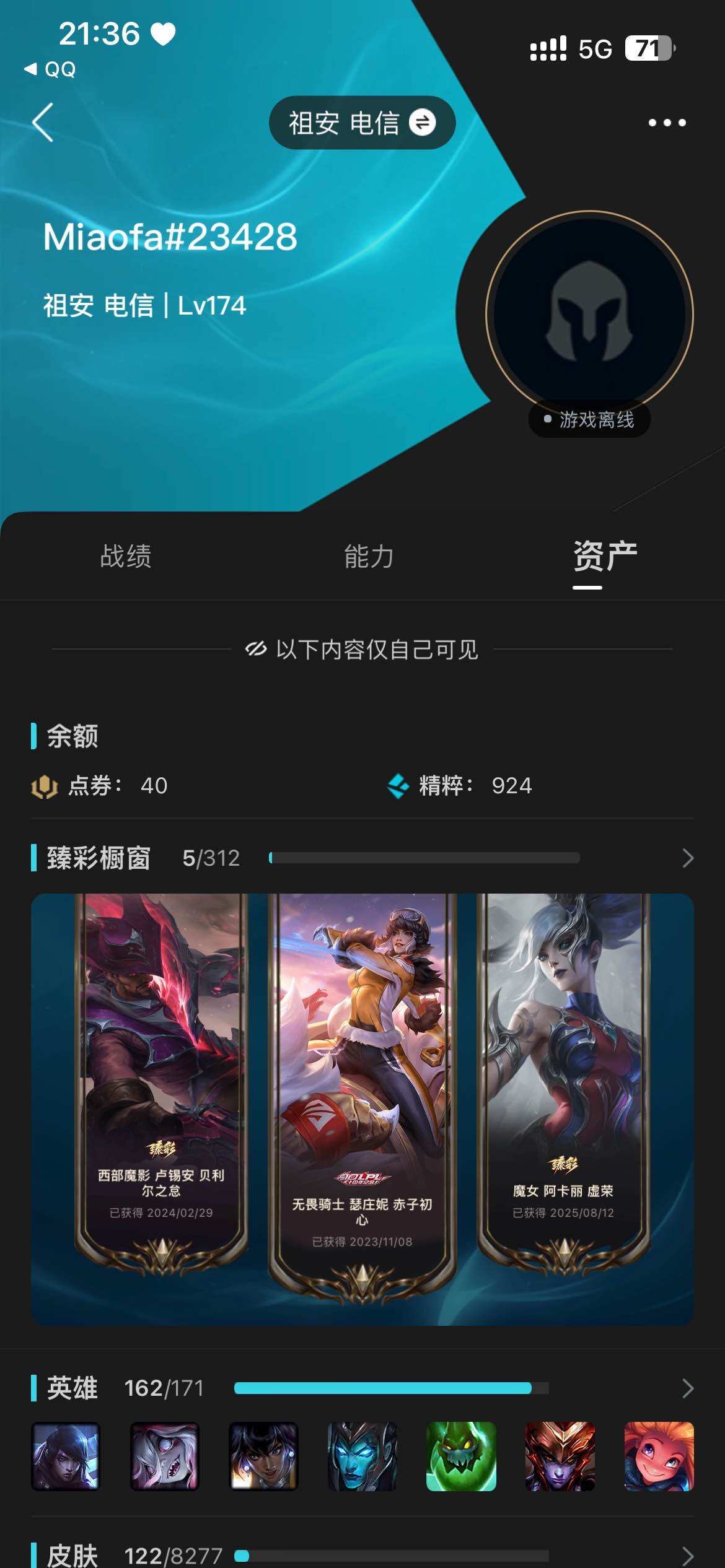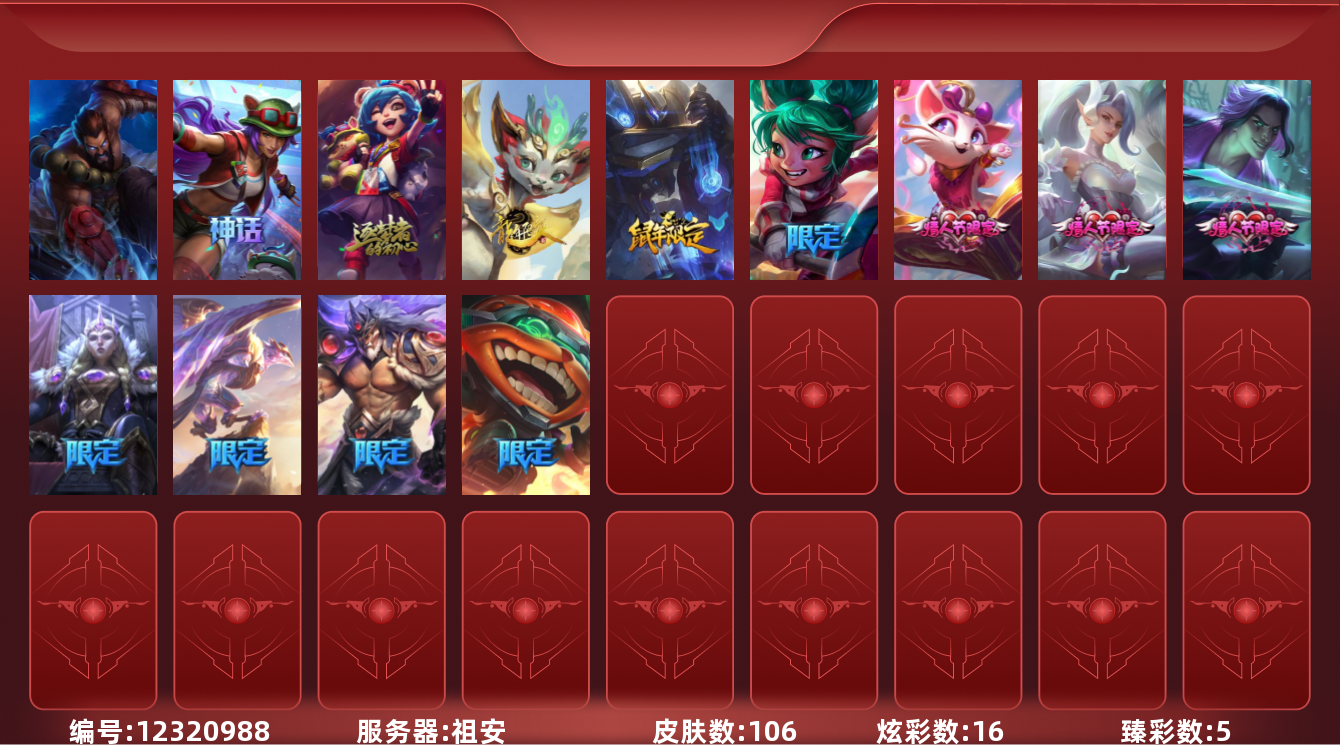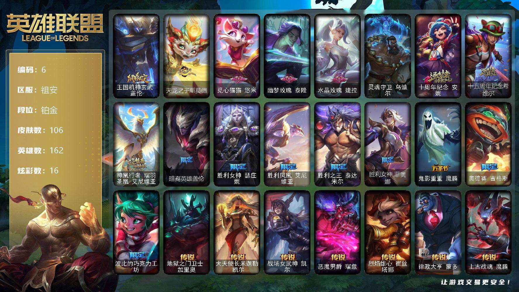 [12320988]零零零1354524 qq不可二次 【商品标题】:铂金段位-162英雄-106皮肤-16炫彩-1终极-3神话-13限定-15传说-21史诗 【臻彩皮肤】:无畏骑士瑟庄妮赤子初心,西部魔影卢锡安贝利尔之怠,星之守护者卡莎热情之光,咖啡甜心格温酒醉樱桃,魔女阿卡丽虚荣 【年限皮肤】:王国机神玄武盖伦,天龙之子斯莫德 【情人节限定】...