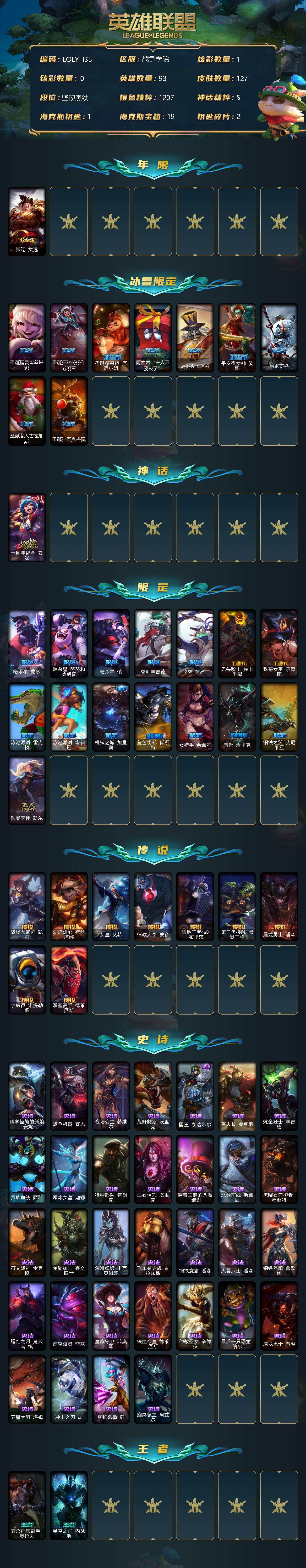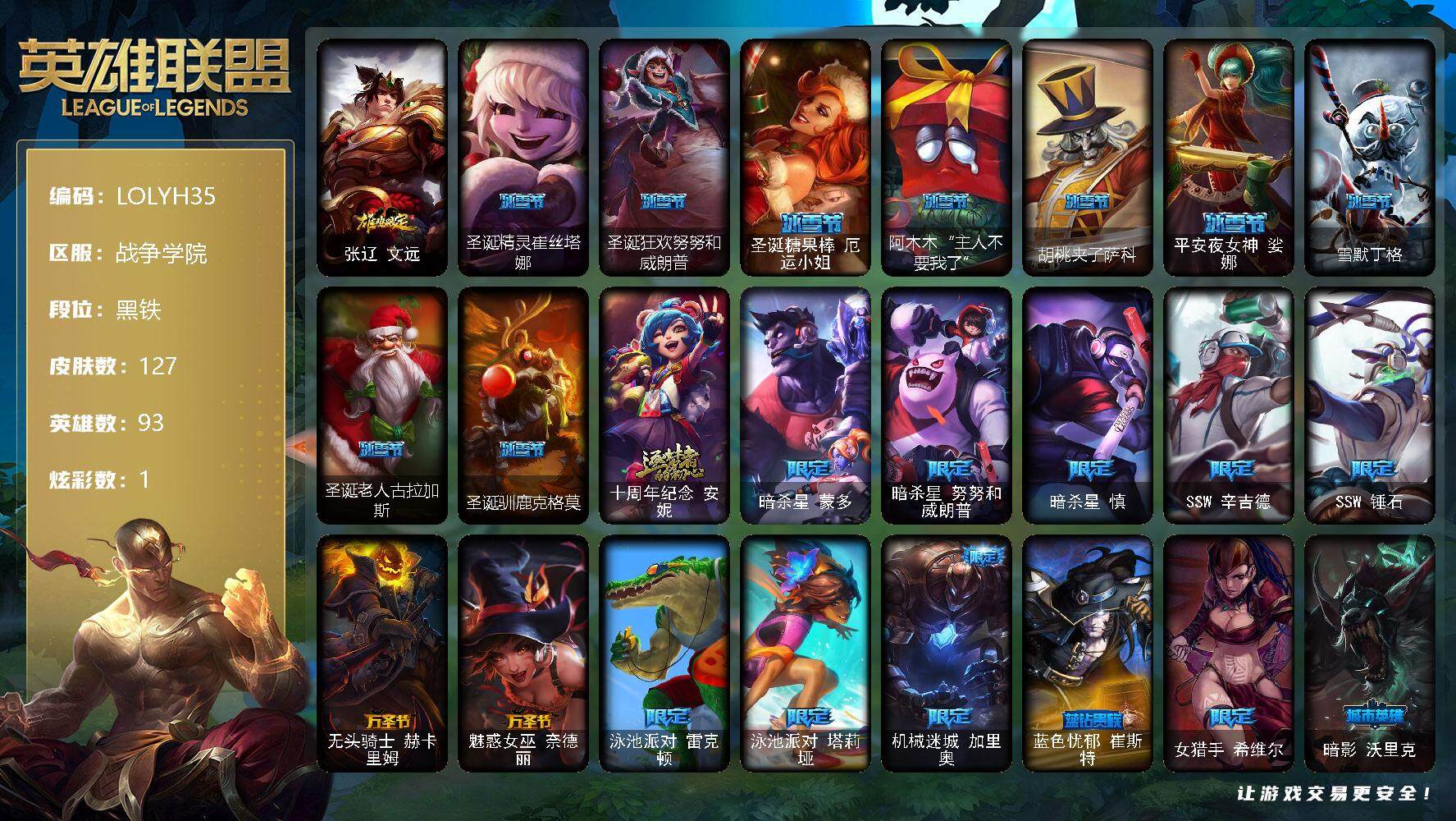 【10881179】【LOLYH35】93英雄/127皮肤/1神话/25限定/1炫彩/9传说/32史诗/黑铁/张辽文远/圣诞精灵崔丝塔娜/圣诞狂欢努努和威朗普/圣诞糖果棒厄运小姐/阿木木:“主人不要我了”/胡桃夹子萨科/平安夜女神娑娜/雪默丁格/圣诞老人古拉加斯/圣诞驯鹿克格莫/十周年纪念安妮/暗杀星蒙多/暗杀星努努和威朗普/暗杀星慎/SSW辛吉德/SSW锤石/无头骑士赫卡里姆/魅惑女巫奈德丽/
