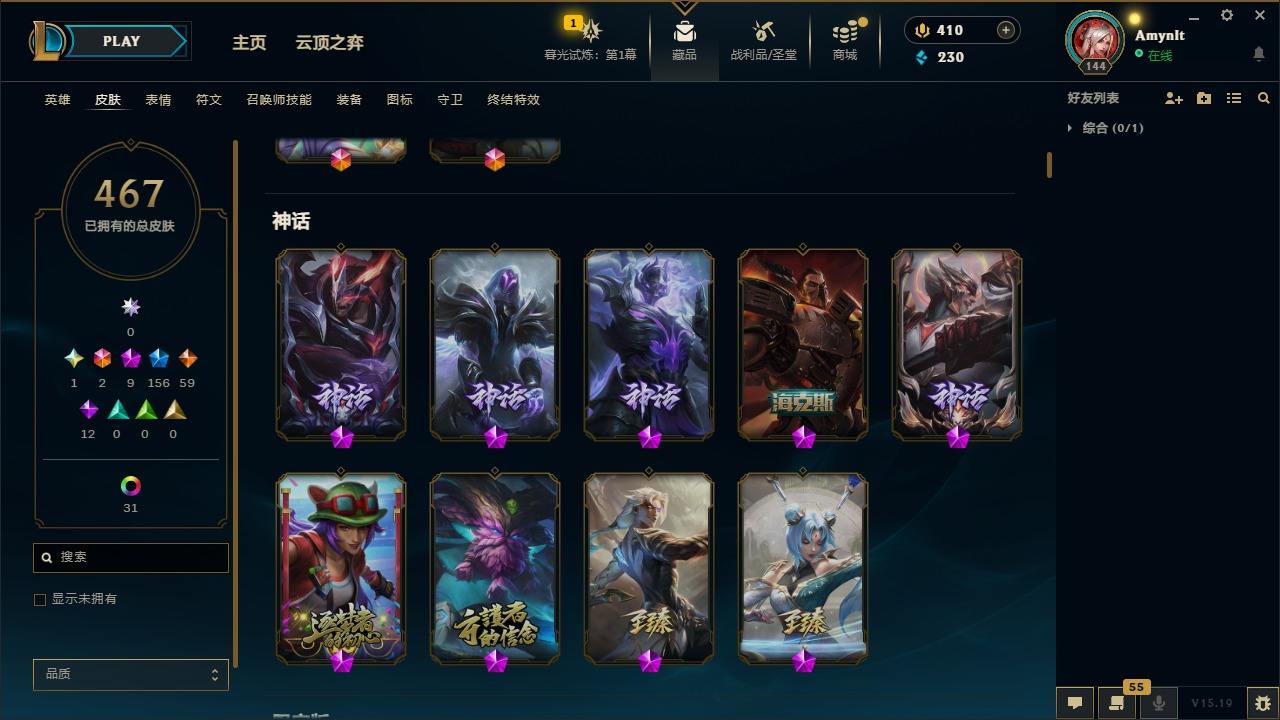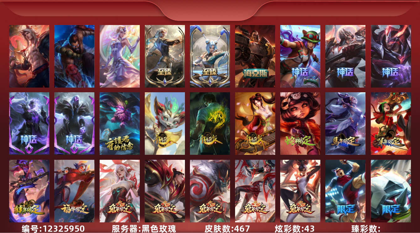 【10881335】[12325950]2终极 9神话 156限定 59传说 12史诗 467皮肤 43炫彩 119英雄 可二次 可修改实名 优质装备:穿星魔锋,冰原核弹,至臻 黑夜使者 凯隐,永恒之森 奥恩,地底世界 崔斯特,电玩战魂 人马,防爆士兵 炼金,冠军掠夺者 卡兹克,冠军蔷薇 乐芙兰,冠军之矛 滑板鞋,冠军之刃 锐雯 2016,冠军之隐 劫,冠军之志 瑞兹,红桃杰克 崔斯特,鸡里奥,