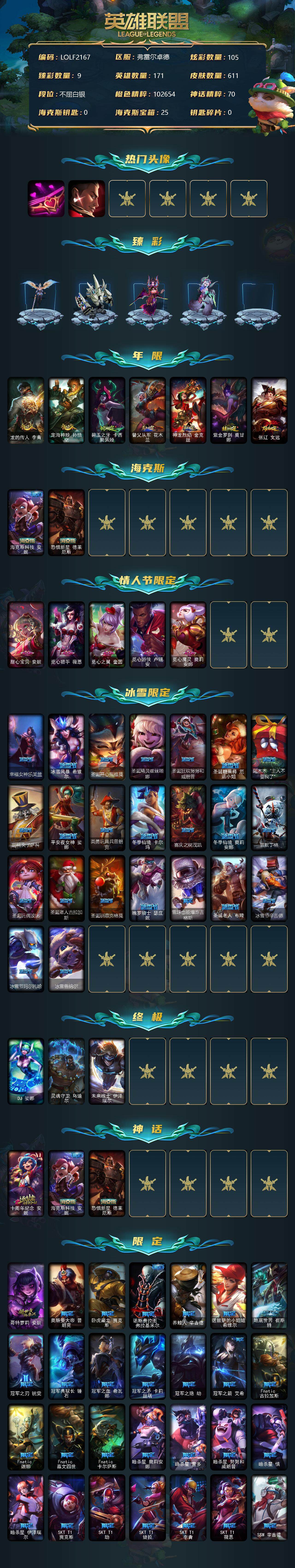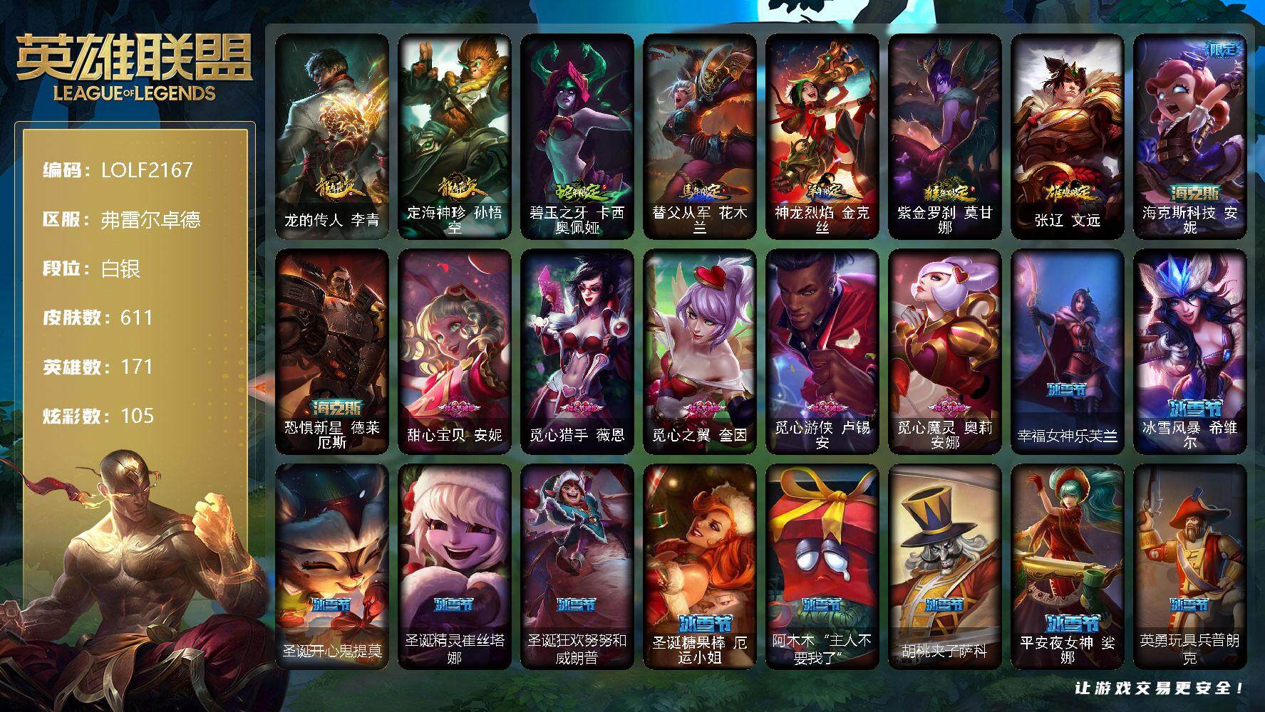 【10882439】【LOLF2167】171英雄/611皮肤/3终极/3神话/119限定/9臻彩/105炫彩/58传说/170史诗/白银/爱情之歌/觅心游侠卢锡安/天龙之子卡莎飞龙乘云/墨之影武者亚索金墨耀影/玉剑传说翼剑仙珠光/霸天巨兽雪崩墨菲特/星之吞噬者莫甘娜热情之末/魔女阿卡丽虚荣/净雪之月莫甘娜冬虹/幻灵战斗兔阿萝拉梦幻强袭/心之钢伊泽瑞尔天纵才华/龙的传人李青/定海神针孙悟空/碧玉
