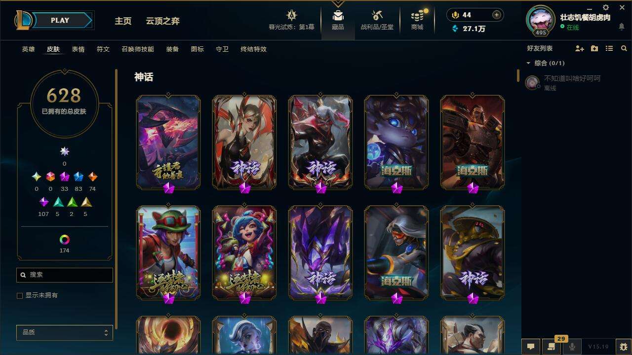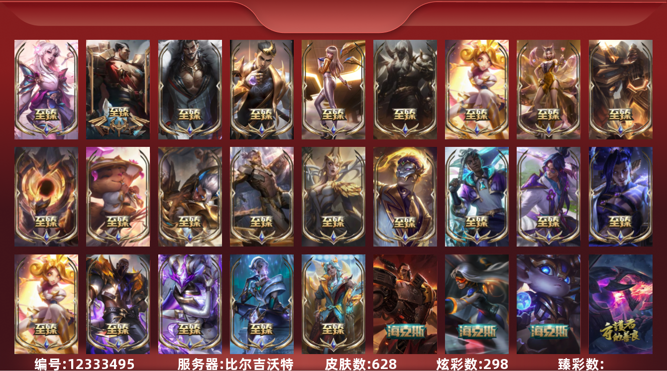 【10882570】[12333495]【gpz_961735】 t27639【比尔吉沃特】628皮肤 298炫彩 24臻彩 33神话/83限定/74传说/171英雄 账号等级:495 云顶神话:4 单双排段位:黄金【重要头像】云顶战斗学院伊泽瑞尔 云顶古琴娑娜 觅心之翼奎因 华洛 可爱悠米 可爱安妮 【重要皮肤】莲华温泉厄斐琉斯至臻 灵魂莲华拉克丝至臻 凯旋将军德莱厄斯至臻