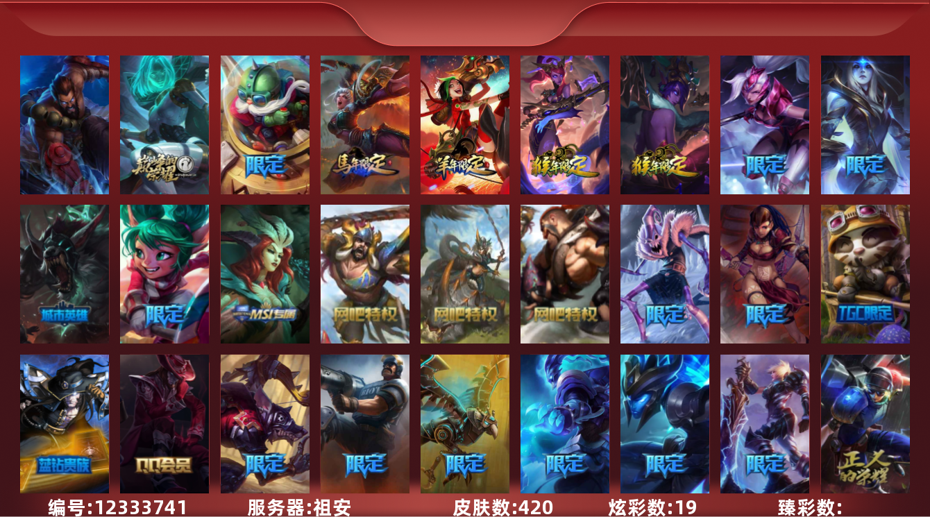 【10882634】[12333741]【gpz_961737】 t27643【祖安】420皮肤 19炫彩 4臻彩 3神话/76限定/36传说/157英雄 账号等级:324【重要头像】小斗 【重要皮肤】胜利女神希维尔 舞会公主安妮 电玩女神厄运小姐 星之守护者伊泽瑞尔 替父从军花木兰 神龙烈焰金克丝 定海神珍孙悟空 玉净夜叉凯特琳 紫金罗刹莫甘娜 胜利之树茂凯 胜利机器人