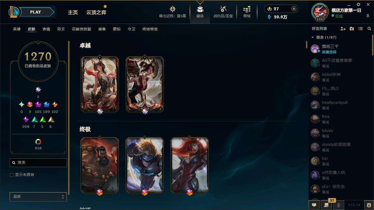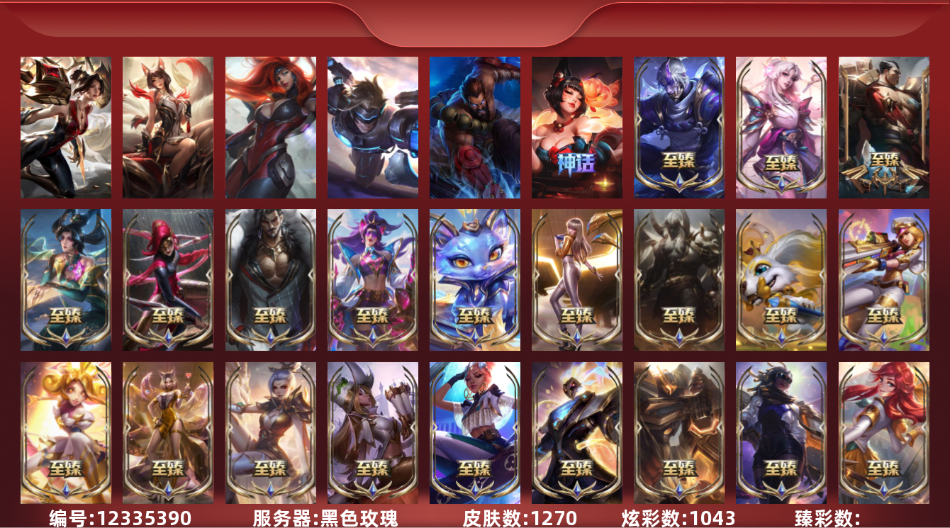 【10883077】[12335390]【gpz_961749】 t27655【黑色玫瑰】殿堂传奇卡莎 殿堂传奇阿狸 1270皮肤 1043炫彩 49臻彩 105神话/199限定/102传说/171英雄 账号等级:1121 云顶神话:2 单双排段位:翡翠【重要头像】云顶战斗学院伊泽瑞尔 云顶古琴娑娜 云顶星守阿卡丽 心型钥匙 觅心游侠卢锡安 大家伙 春晖神女拉克丝 我麦是开的么