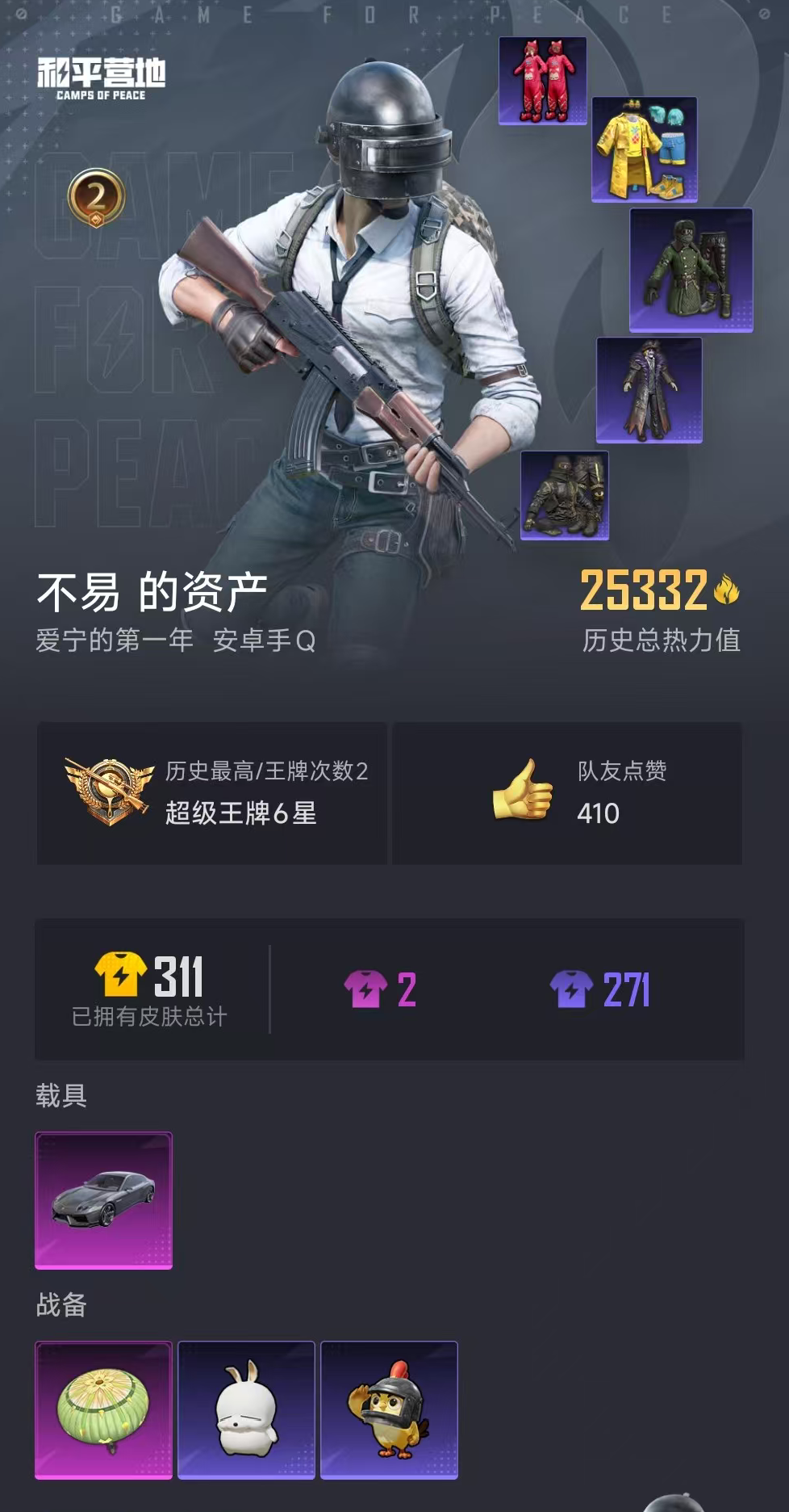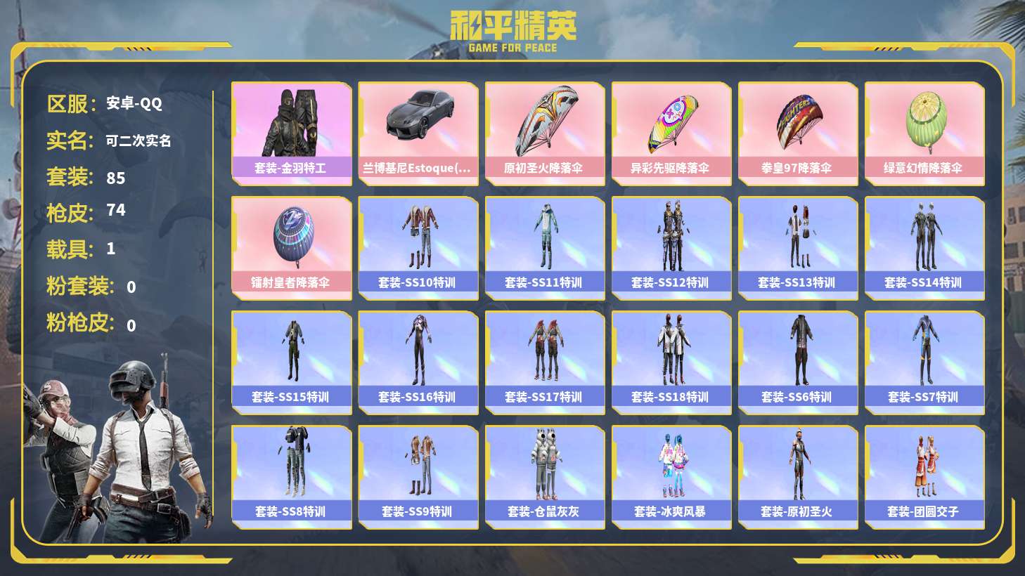 【10883287】【和平精英】【LYHP13078】2.5w热力值1载具 兰博基尼 0粉装,0特效枪,1载具,历史最高段位:超级王牌6星 王牌印记2次 热力值:25332,85套装,74枪械,76装备,54战备;套装:套装-特训学院,套装-青年教官,套装-黄色运动,套装-蓝色运动,套装-黄色伏地魔,套装-白色伏地魔,套装-黑色伏地魔,套装-竞技名士,套装-湖蓝色名流,套装-黄色名流,套装-猛禽
