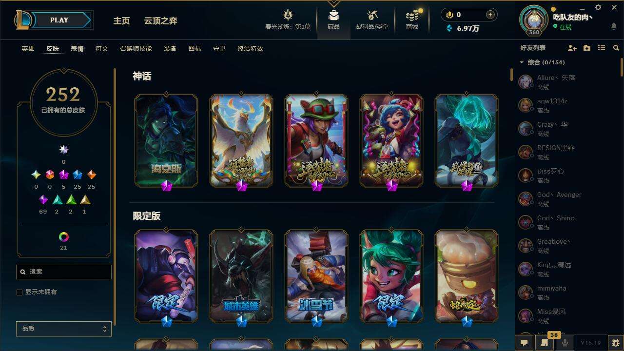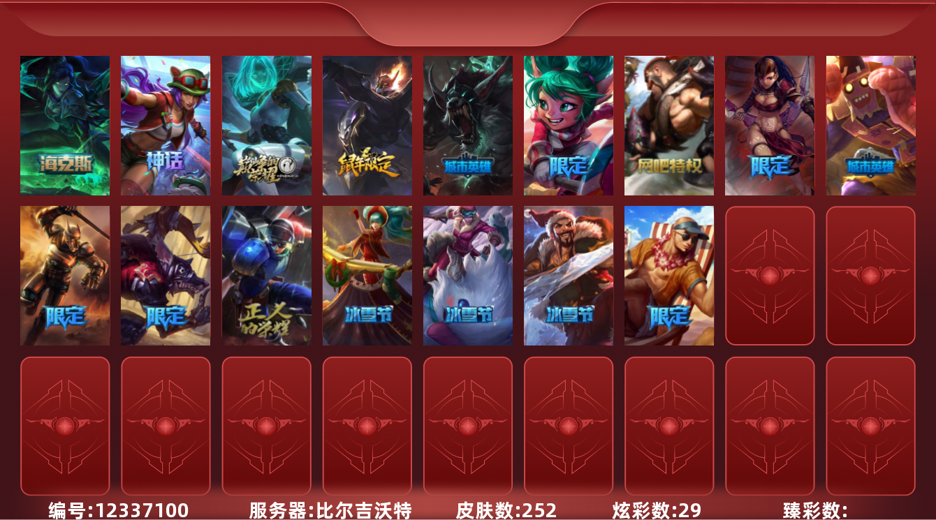 【10883509】[12337100]【gpz_961766】 t27665【比尔吉沃特】252皮肤 29炫彩 5臻彩 5神话/25限定/25传说/171英雄 账号等级:360 云顶神话:1 单双排段位:青铜【重要头像】爱意绵绵 卡特琳娜的匕首 冠军之箭艾希凯旋盛装 【重要皮肤】摄魂使者薇恩 点心宝贝阿木木 王国机神青龙德莱文 胜利枪神卢锡安 圣诞老人德莱文 魄罗骑士瑟庄妮