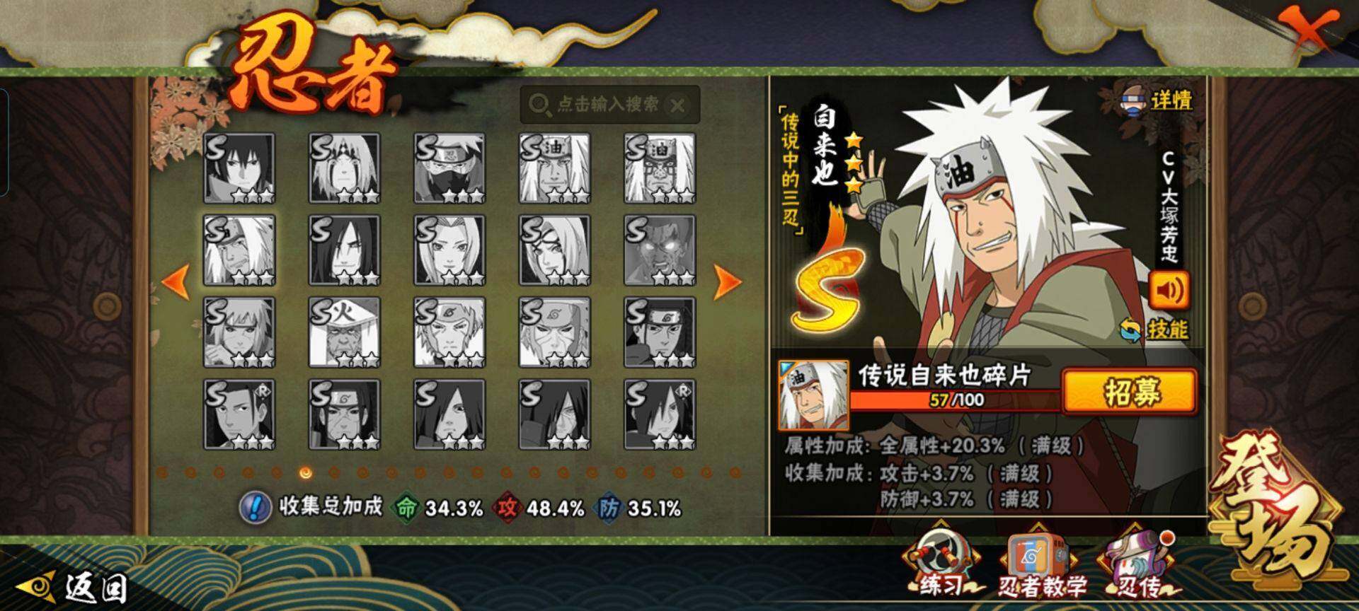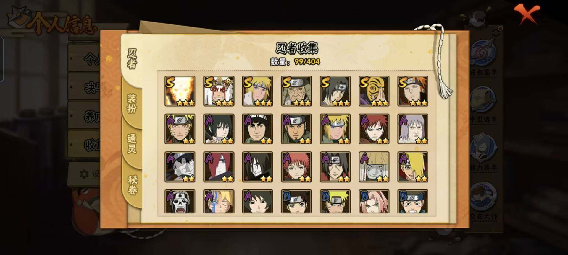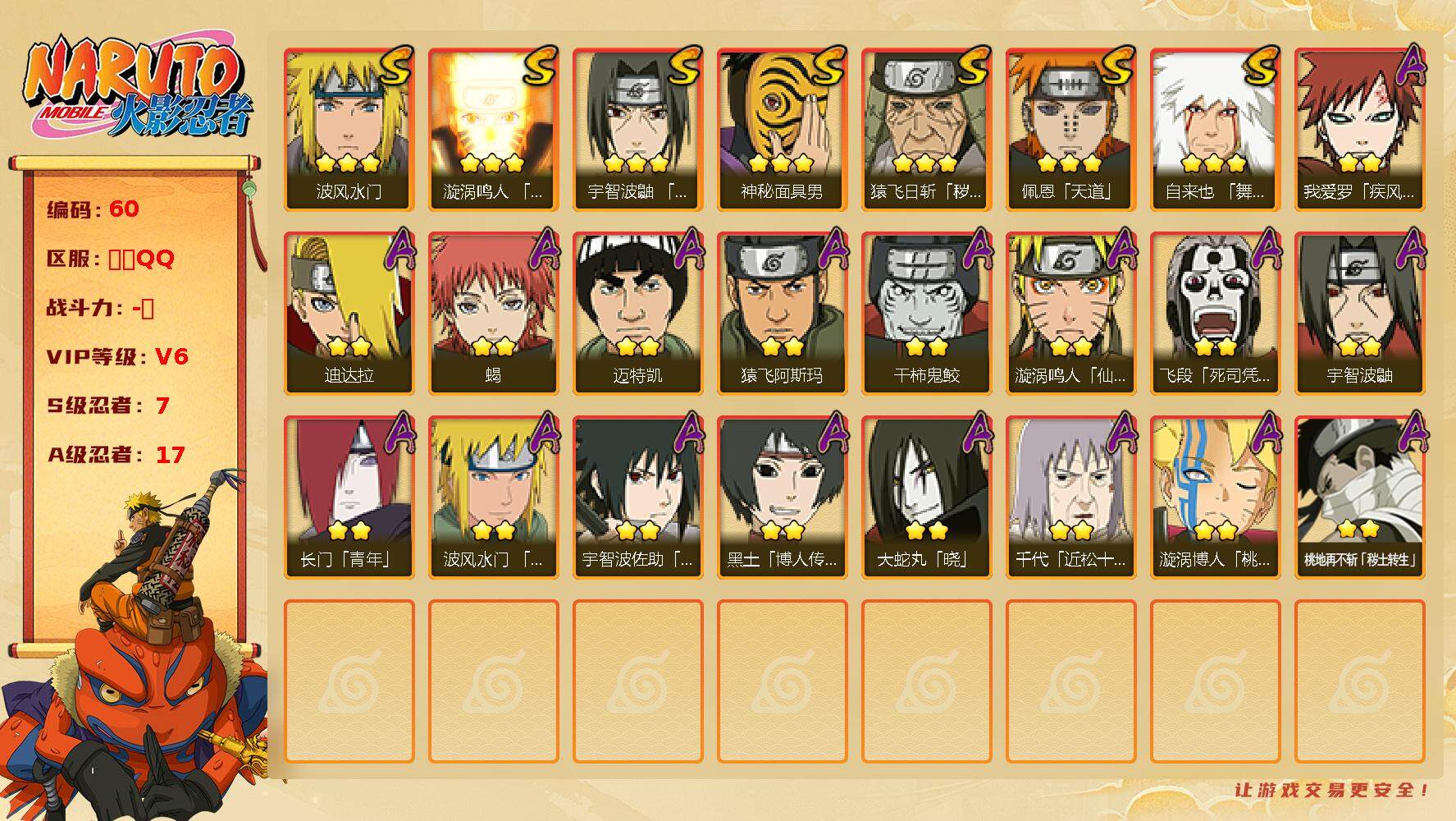 [12337185]【商品标题】:7S级忍者数-17A级忍者数 【S级忍者】:猿飞日斩「秽土转生」(3星),宇智波鼬「须佐能乎」(3星),自来也「舞之豪杰」(3星),波风水门(3星),神秘面具男(3星),漩涡鸣人「九喇嘛连结」(3星),佩恩「天道」(3星) 【A级忍者】:长门「青年」(2星),波风水门「青年」(2星),迪达拉(2星),大蛇丸「晓...