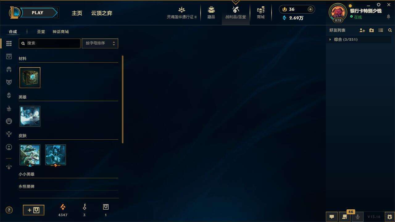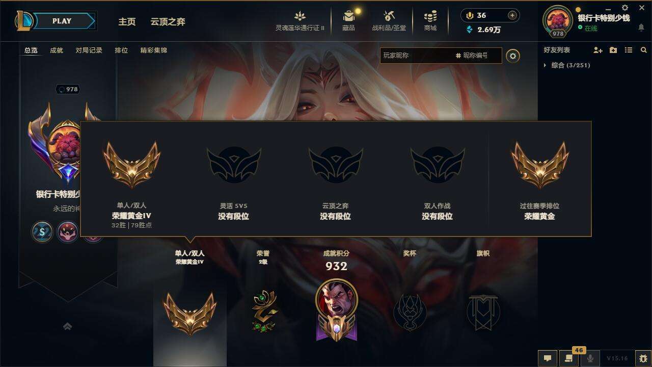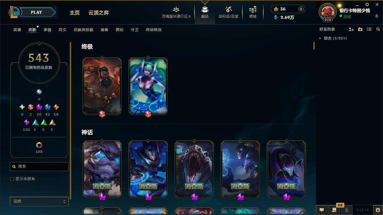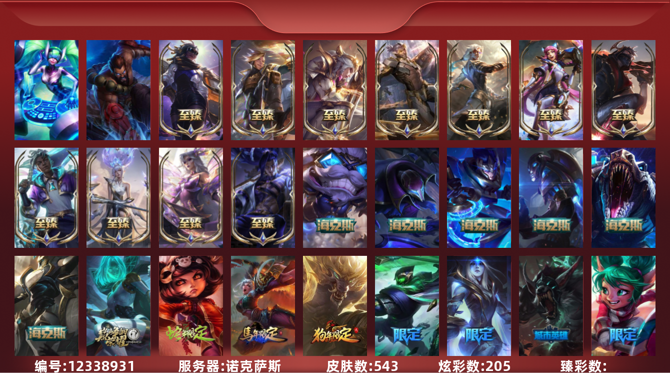 【10883999】[12338931]【gpz_961792】 t25099【诺克萨斯】 543皮肤 205炫彩 6臻彩 20神话/42限定/59传说/170英雄 账号等级:978 单双排段位:荣耀黄金 【重要头像】爱情之歌 至臻海珀利安小队迦娜 至臻幻灵战斗猫金克丝 【重要皮肤】墨之影武者亚索至臻 花仙使者卡特琳娜至臻 海珀利安小队X09星环灵风迦娜至臻 星之守护者艾克至臻 西部魔影猎天使