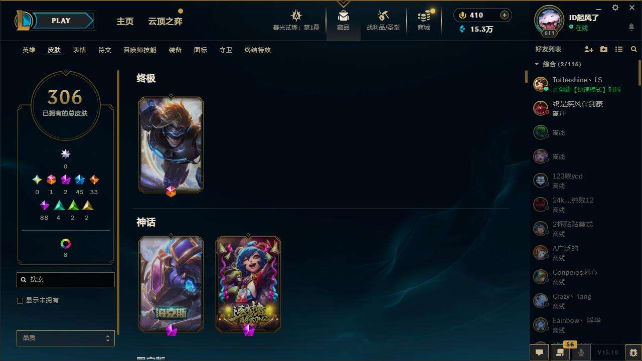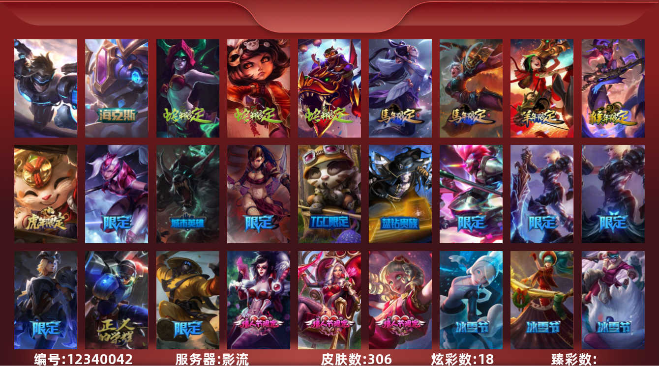 【10884294】[12340042]【gpz_961806】 t27679【影流】306皮肤 18炫彩 1臻彩 2神话/45限定/33传说/167英雄 账号等级:611【重要头像】爱情之歌 击拳 披萨鸡 【重要皮肤】海克斯科技克格莫 钢铁军团拉克丝 电玩女神阿狸 招财进宝提莫 替父从军花木兰 神龙烈焰金克丝 碧玉之牙卡西奥佩娅 你看见过我的熊猫吗安妮 玉净夜叉凯特琳