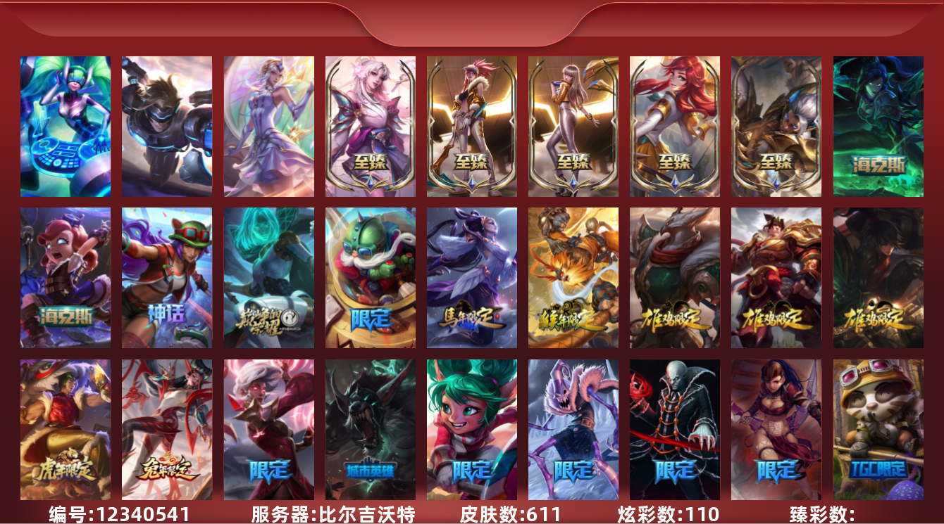 【10884460】[12340541]【gpz_961808】 t27680【比尔吉沃特】黑龙瞎 611皮肤 110炫彩 9臻彩 13神话/106限定/54传说/170英雄 账号等级:512【重要头像】爱情之歌 觅心游侠卢锡安 冬境仙灵妮蔻 卡特琳娜的匕首 青花瓷伊泽瑞尔炫彩 福牛守护者厄斐琉斯 战斗学院伊泽瑞尔 【重要皮肤】灵魂莲华拉克丝至臻 神龙尊者炎龙瑟提至臻 KDA