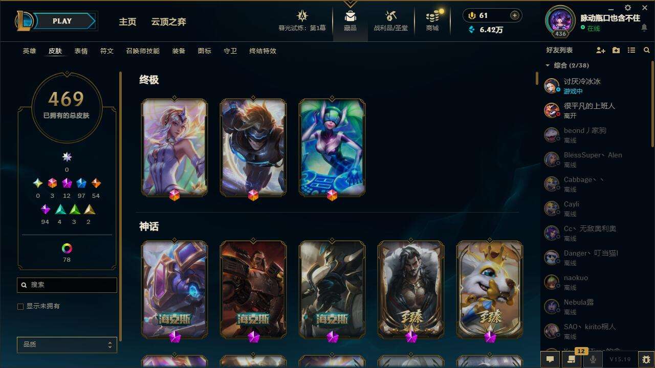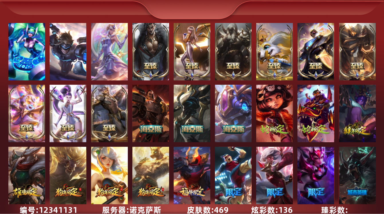 【10884627】[12341131]【gpz_961817】 t27683【诺克萨斯】黑龙瞎 469皮肤 136炫彩 18臻彩 12神话/97限定/54传说/171英雄 账号等级:436 单双排段位:白银【重要头像】至爱的鹿 春晖神女拉克丝 我麦是开的么 泳池派对凯特琳 幼犬内瑟斯 幼犬沃里克 披萨鸡 西部魔影莎弥拉 西部魔影莎弥拉炫彩 西部天使赛娜神话炫彩 西部魔影卢