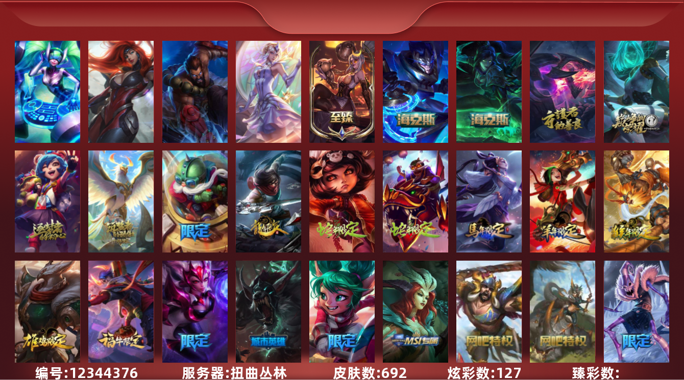 【10885406】4终极 8神话 116限定 64传说 182史诗 692皮肤 127炫彩 可二次 可修改实名 优质装备:至臻 烈焰美人 薇恩,哥特萝莉,源代码 乐芙兰,防爆天使 凯尔,暗影 沃里克,巧克力工坊 波比,电玩战魂 人马,都铎王朝 图奇,夺命美人 卡特,防爆士兵 炼金,钢铁之翼 凤凰,冠军典狱长 锤石,冠军之箭 艾希,冠军之刃 锐雯 2016,冠军之血 希瓦娜,红桃杰克 崔斯特,鸡