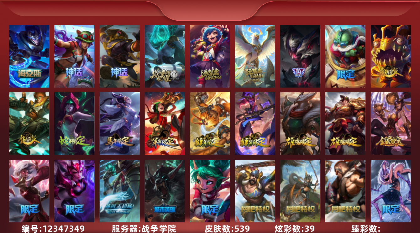 【10886184】6神话 88限定 46传说 140史诗 539皮肤 39炫彩 166英雄 可二次 可修改实名 优质装备:源代码 乐芙兰,防爆天使 凯尔,暗影 沃里克,巧克力工坊 波比,地底世界 崔斯特,电玩战魂 人马,都铎王朝 图奇,防爆士兵 炼金,钢铁之翼 凤凰,冠军之矛 滑板鞋,红桃杰克 崔斯特,机械迷城 加里奥,警用试作体K-9 内瑟斯,蒙多蒙多,密林猎手 提莫,女猎手 希维尔,诺斯费