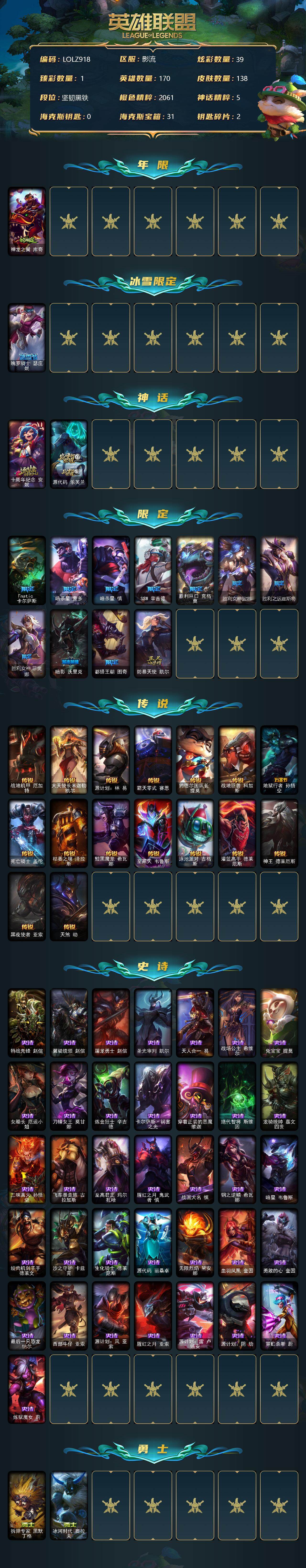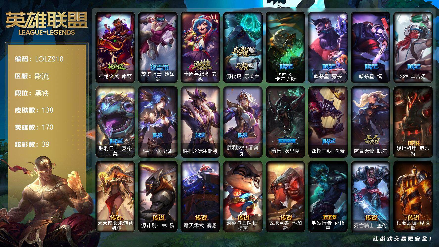 【10886185】【LOLZ918】170英雄/138皮肤/2神话/13限定/1臻彩/39炫彩/16传说/36史诗/黑铁/魔女阿卡丽虚荣/神龙之翼库奇/魄罗骑士瑟庄妮/十周年纪念安妮/源代码乐芙兰/Fnatic卡尔萨斯/暗杀星蒙多/暗杀星慎/SSW辛吉德/胜利巨口克格莫/胜利女神娑娜/胜利之运崔斯特/胜利女神菲奥娜/暗影妖狐阿狸/都铎王朝图奇/防暴天使凯尔/战地机甲厄加特/大天使长米迦勒凯尔/
