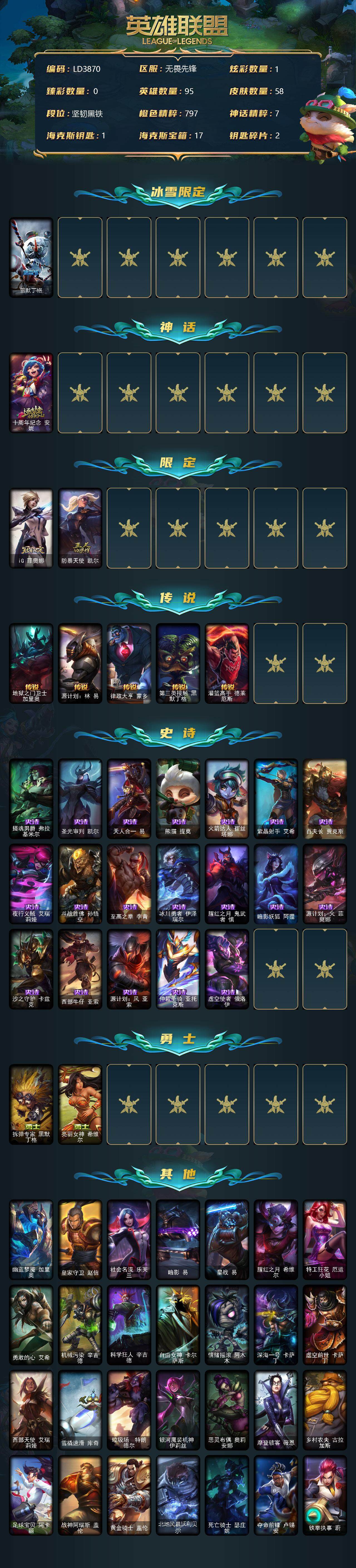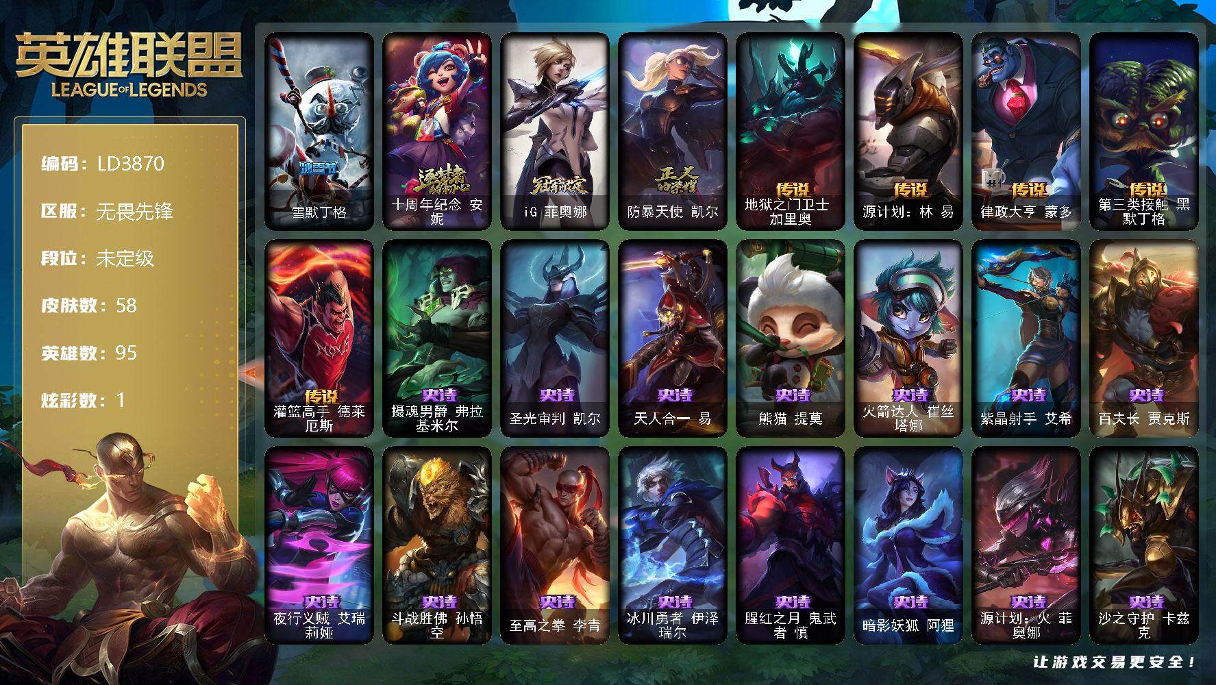 【10886746】【LD3870】95英雄/58皮肤/1神话/3限定/1炫彩/5传说/19史诗/未定级/雪默丁格/十周年纪念安妮/IG菲奥娜/防暴天使凯尔/地狱之门卫士加里奥/源计划:林易/律政大亨蒙多/第三类接触黑默丁格/灌篮高手德莱厄斯/摄魂男爵费拉基米尔/圣光审判凯尔/天人合一易/熊猫提莫/火箭达人崔丝塔娜/紫晶射手艾希/百户长贾克斯/夜行义贼艾瑞莉娅/斗战胜佛孙悟空/至高之拳李青/冰川