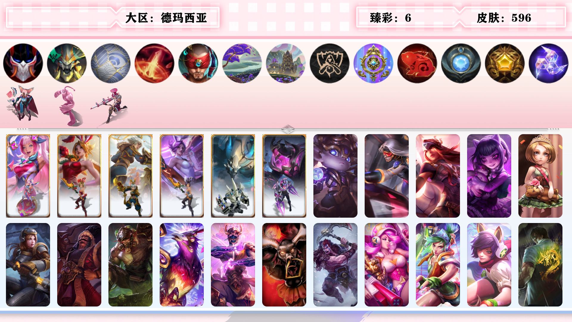 【10887114】[12350718]英雄联盟(LOL)-联盟五区-德玛西亚 596皮肤 81炫彩 6臻彩 5神话/134限定/45传说/171英雄 账号等级:742 【重要皮肤】海克斯科技波比 新创战纪希维尔 胜利女神希维尔 哥特萝莉安妮 舞会公主安妮 钢铁军团拉克丝 奥斯曼大帝泰达米尔 生化领主泰达米尔 庆典女皇艾尼维亚 荣誉使者玛尔扎哈 暗黑灵魂阿利斯塔 勇敢的心德莱厄斯 电玩女神厄运小