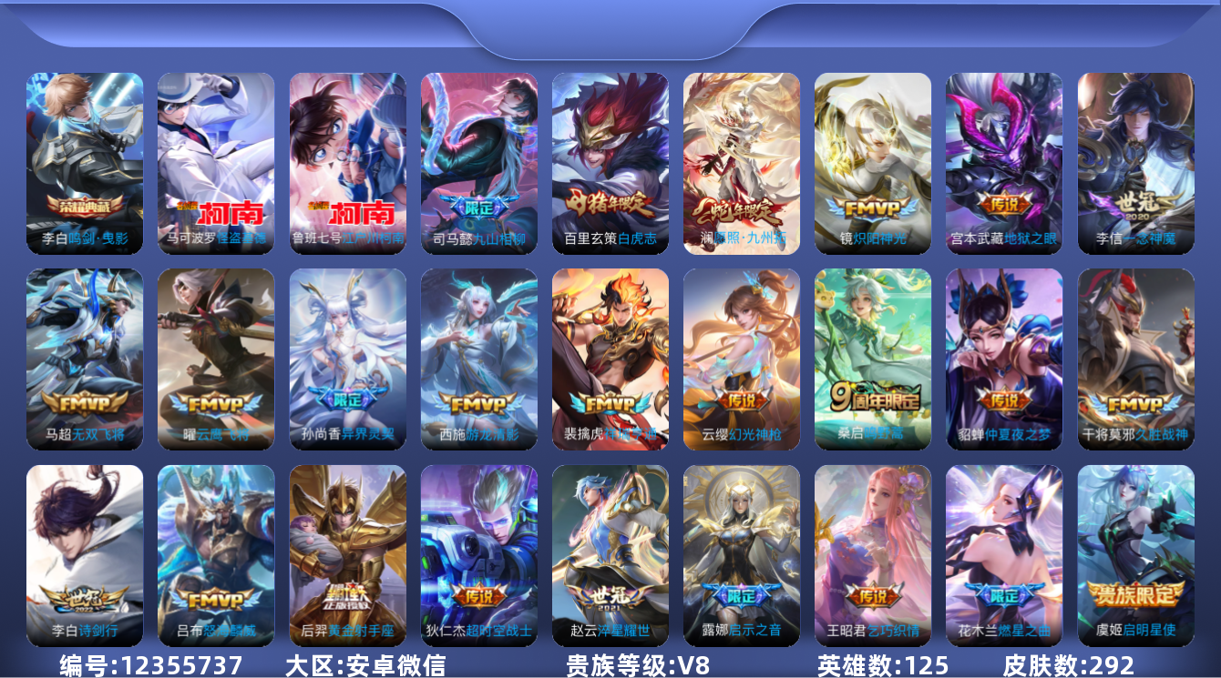 【10888446】【不可二次】【微信(安卓)】霸王丸 黎明之约 乱世虎臣 暗影游猎 鹰眼统帅 水晶猎龙者 晚萤 原初探秘者 永昼 圣诞恋歌 星夜王子 岱宗 沙漠行僧 紫霞仙子 炽弈燎原 烛龙 仲夏夜之梦 缤纷独角兽 江户川柯南 万华元夜 御銮 修罗 千军破阵 特工魅影 诗剑行 启示之音 醍醐杖 德古拉伯爵 江河有灵 古海寻踪 孙行者 荣光圣徽 魅力维加斯 久胜战神 云鹰飞将 箭羽风息 御旌 弈