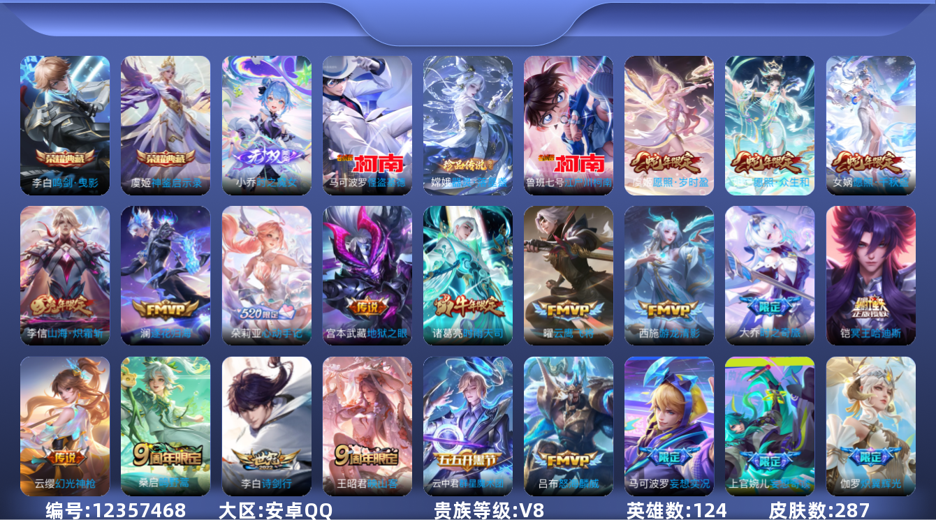 【10888831】【不可二次】【QQ(安卓)】霸王丸 星界游侠 后羿如梦令 暗影游猎 水晶猎龙者 美猴王 原初探秘者 圣诞恋歌 优雅恋人 星夜王子 沙漠行僧 紫霞仙子 遇见神鹿 神鉴启示录 仲夏夜之梦 缤纷独角兽 江户川柯南 万华元夜 御銮 千军破阵 特工魅影 诗剑行 醍醐杖 德古拉伯爵 古海寻踪 丁香结 妄想实况 电玩小子 孙行者 女武神 魅力维加斯 浮梦罗烟 云鹰飞将 箭羽风息 谪仙醉月